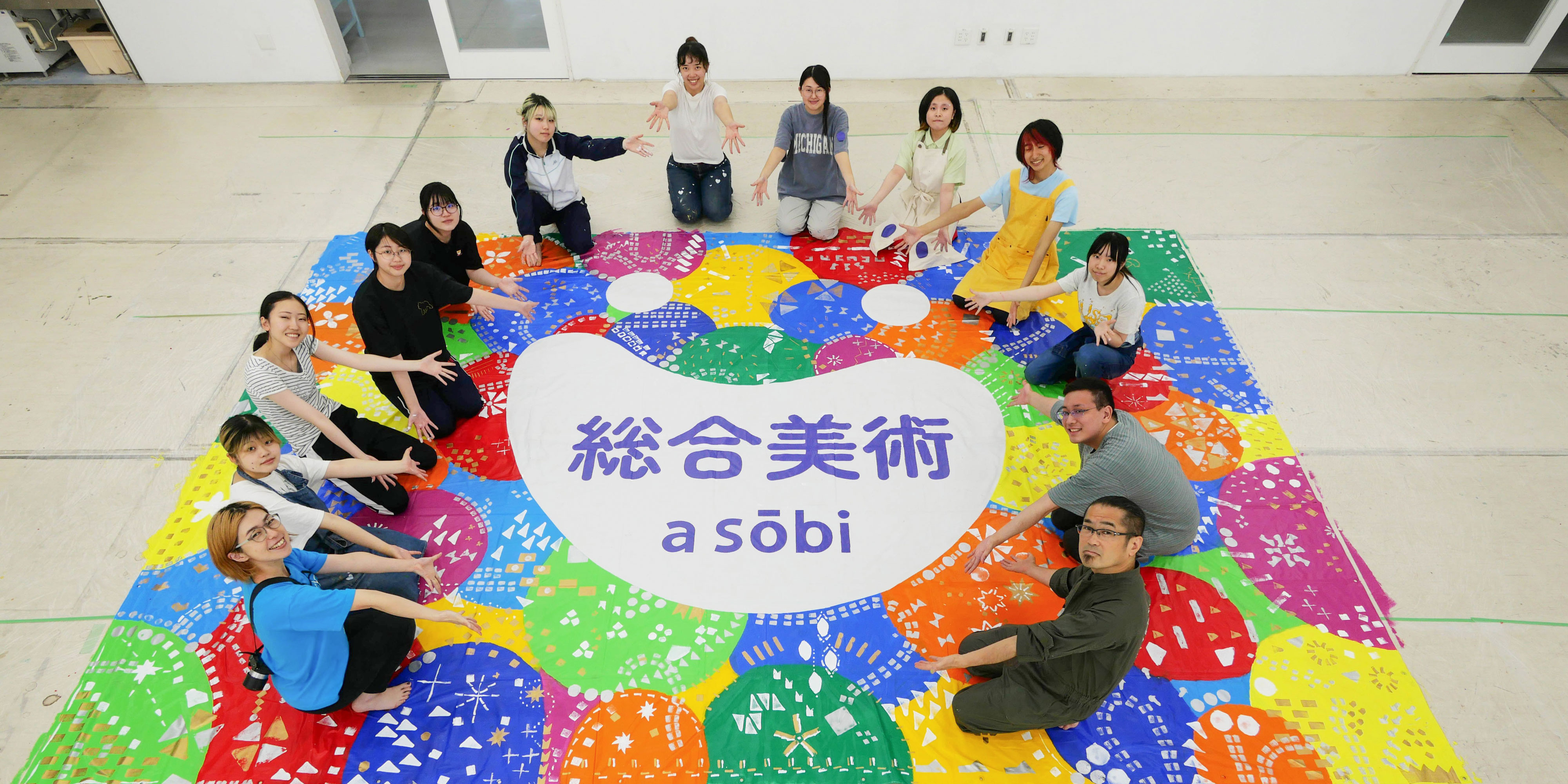 オープンキャンパスに向けて4m×6m の大きなウェルカムバナーの制作を行いました。制作にはスタンピングという絵画技法を使って、みんなで話し合い、協力しながら制作しました。これもアートコミュニケーションの一つです。