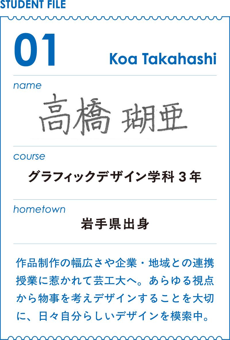 幼い頃から好きだった、絵を描くことやものづくりを仕事にして働きたいという気持ちが強く、具体的に調べ始めたことがきっかけです。「不安定そう」というイメージと、好きなことを仕事にしたいという思いの狭間で、絵やものづくりに関わる分野でありながら、企業で働ける仕事を調べる中、グラフィックデザイナーという仕事と、グラフィックデザイン学科の存在を知り、興味を持ちました。