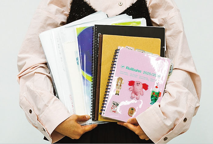 手帳は課題に関するT0 D0 リストやメモ帳として活用。スケッチブックは演習毎に専用の物を用意し、デザイン案や先生からのアドバイスなどを沢山メモしています。