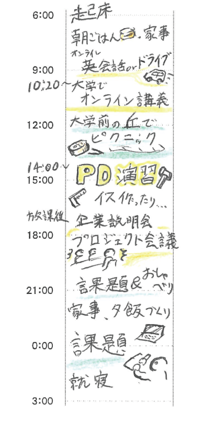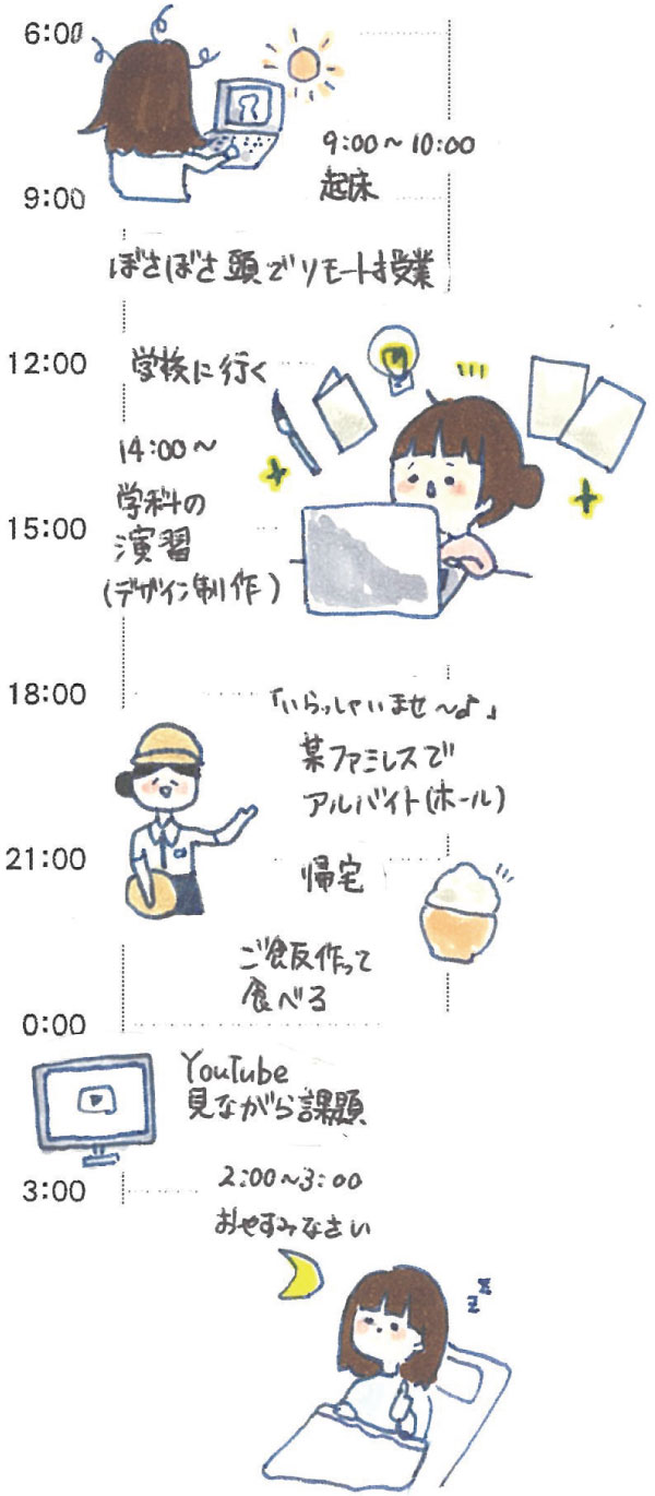 「自分の名前で仕事をいただけるデザイナーになること」と「居心地の良い家で、豊かな生活を送ること」が将来の目標です。まずは目の前の大学の課題に真剣に取り組み、尊敬するデザイナーさんの作品を参考にしながら、自分らしいデザインを模索しています。生活面では、好きな家具や間取り、暮らしの雰囲気など、将来住みたい家や置きたい家具について、日々妄想を膨らませています。