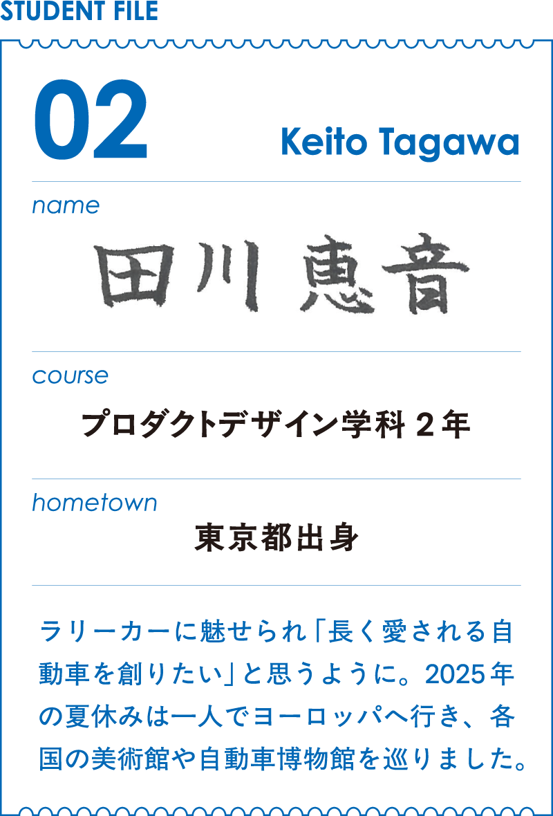 将来の目標は、たくさんの人に愛されるプロダクトを生み出し、カーデザイナーとして歴史に残る車を生み出すことです。いつか、自分がデザインした車で家族旅行をしてみたいです。そのために必要な豊かな表現力と「形で思いを伝える」力を身につけるため日々鍛錬しています。また、いくつかの学生プロジェクトも率いているため、目標に向かってチームで企画・実践する「コトのデザイン」も学びながら、世界中どこに行っても生きていけるデザイナーを目指しています。