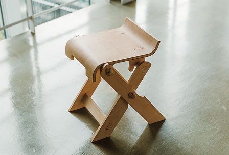2年生後期の成形合板の技術を用いた家具の制作課題で制作。成形合板の強度を活かしつつ、使いやすい椅子の設計に教頭を抱えながら制作しました。