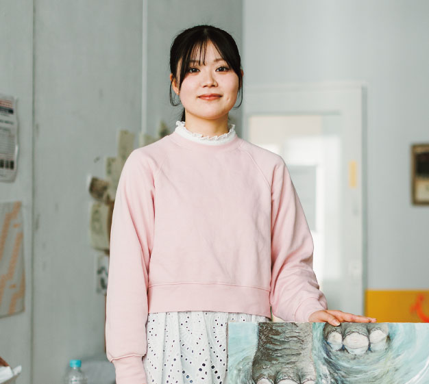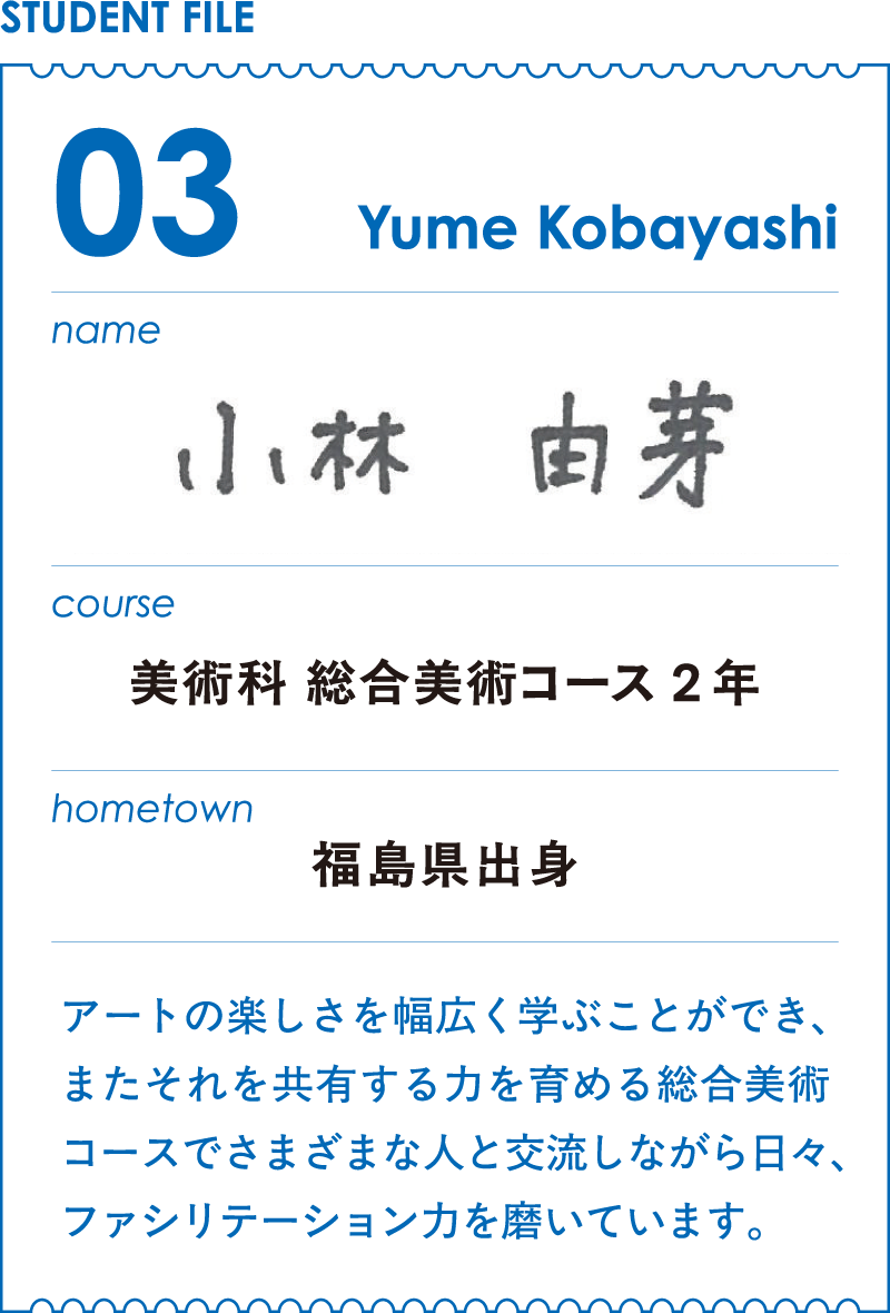 私は元々⽇本画コースを志望していましたが、受験直前になり、第⼆希望を検討する中で総合美術コースに⽬が留まりました。幅広くアートの楽しさについて学ぶことができる点やその楽しさを他者と共有していく⼒を育んでいくカリキュラム内容、先輩⽅の卒業後の進路を知るうちに、⾃⾝が将来⽬指したい⽅向性と重なる部分が多く興味を持つようになりました。