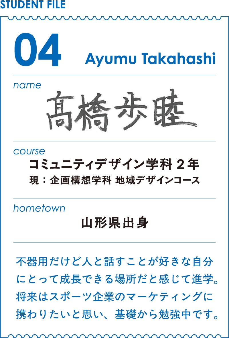 高校までサッカーしかしてこなかった自分は、正直大学進学は考えていませんでした。でも山形に残りたいという気持ちも大きくて、試しに自分の家からも近い芸工大のオープンキャンパスに行ったことがきっかけでした。人と話すことが不器用だけど好きな自分にとっては成長できる場所だと感じたし、学科の気を遣わない雰囲気もすごく印象に残ったことが決め手でした。