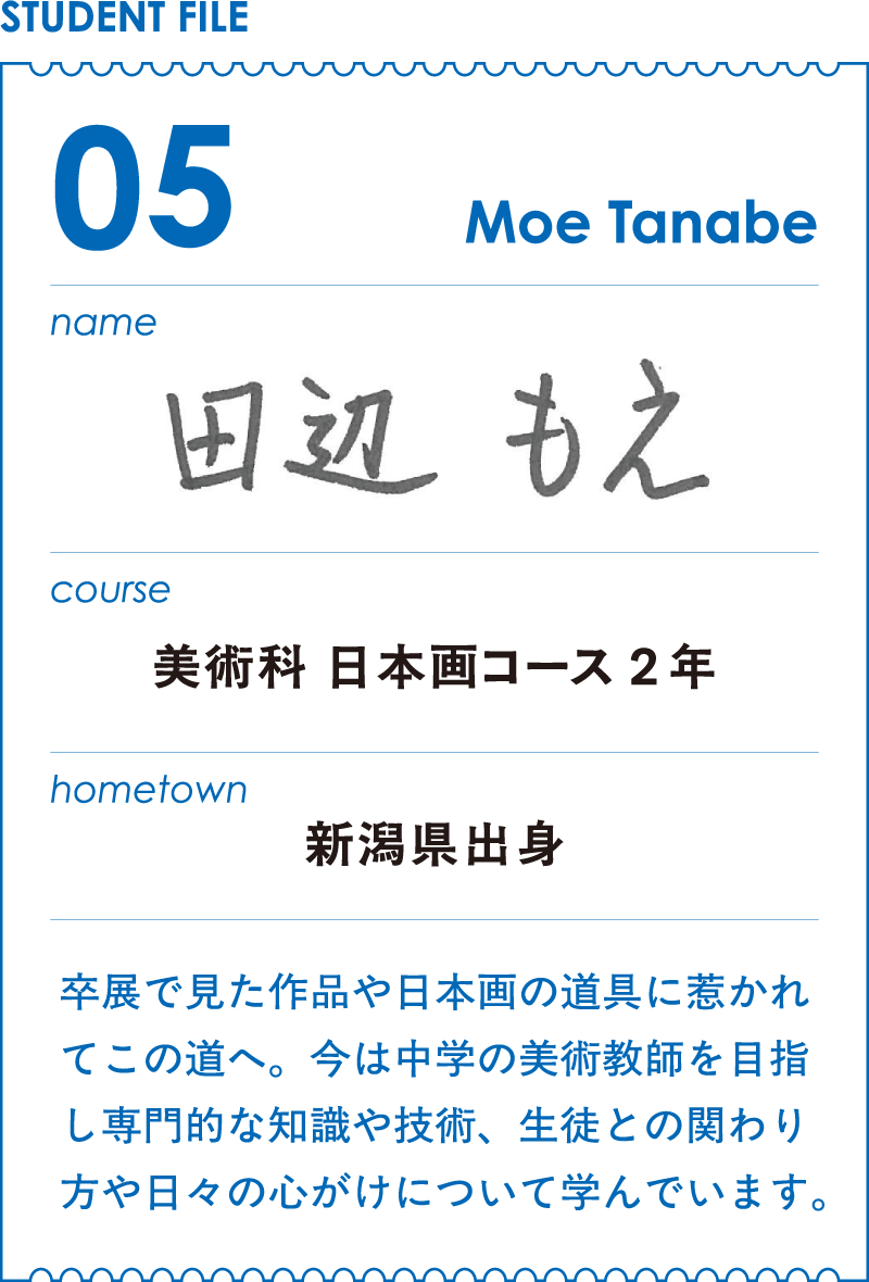 卒業制作展で作品を見たのがきっかけです。大きな桜の木が描かれた日本画を見て、「瑞々しくて良いな」「こんな絵が描きたいな」と思いました。膠や岩絵の具などの道具にも惹かれたので、日本画が自分に合ってるかもしれないと思い、興味を持ちました。
