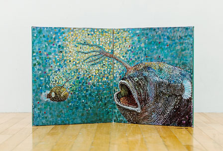 寝室で使うことを想定し、部屋を暗くするとアンコウが光るように夜行ペイントを使用しました。2匹のアンコウが互いを求め合うように光を放つのがポイントです。