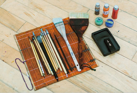岩絵具は粒を塗り重ねることで絵に奥行きを出せるところや、瑞々しいところが魅力です。筆を使い分けることで、繊細な線から力強い線まで幅広く表現できます。