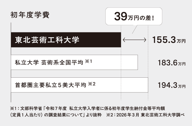 芸工大は公設民営型の大学のため、施設費が不要、かつ実習費もかかりません。だから学費がリーズナブル。首都圏主要私立5美大の初年度学費平均は194.3万円。これに対して芸工大は平均155.3万円。この差は4年間で150万円強にもなります。