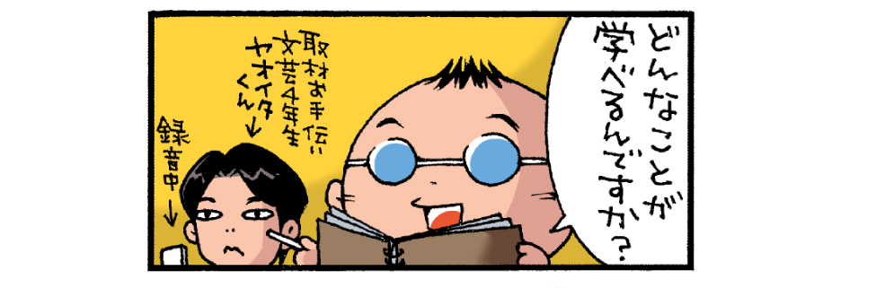 ※このマンガはナカタニD.准教授が担当する、文芸学科の3年生・4年生の演習の一環で制作されました。作品制作に欠かせない「取材」の大切さを学ぶために、実際に様々な対象を取材し、それを基に漫画を描いています。