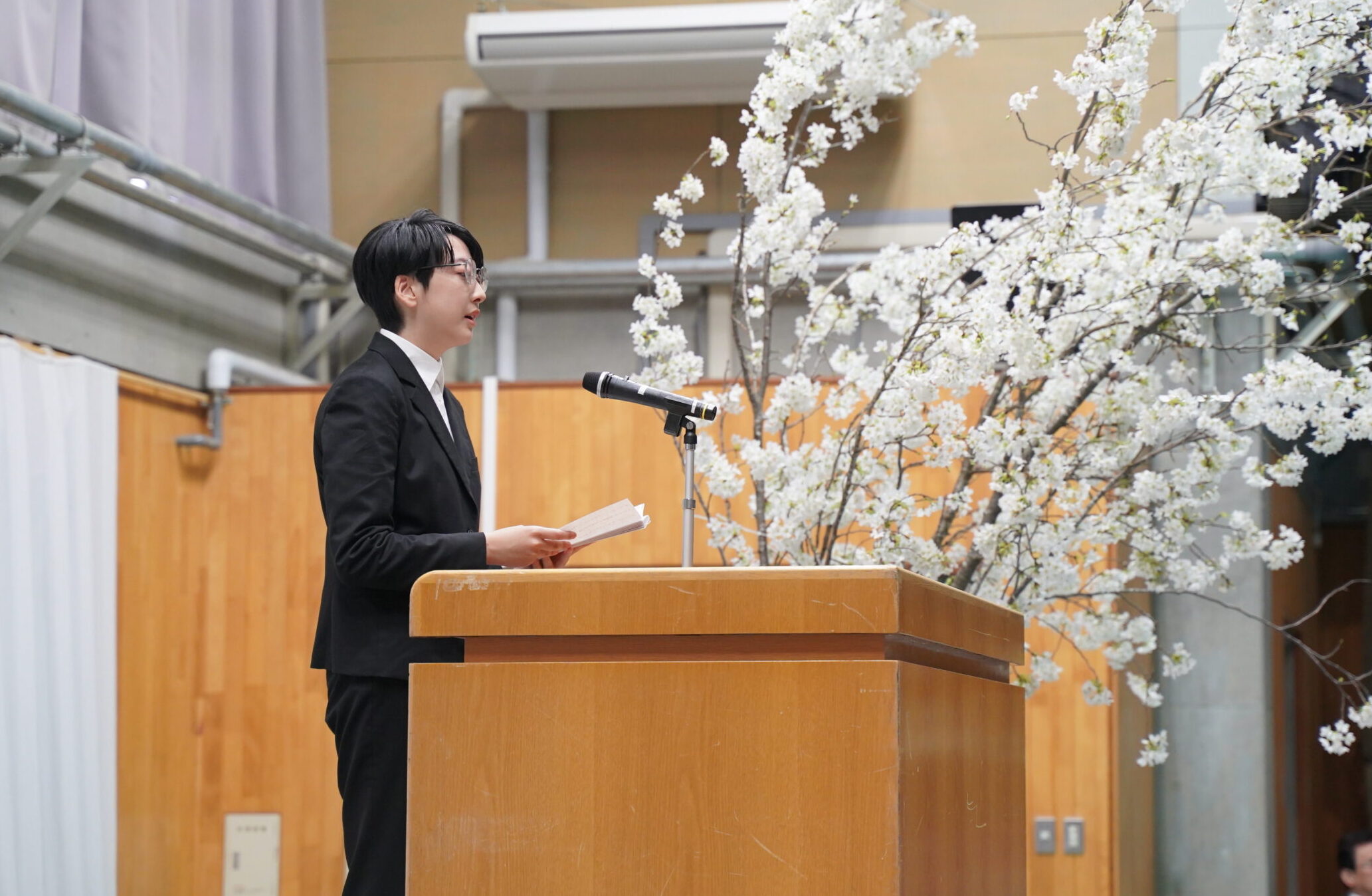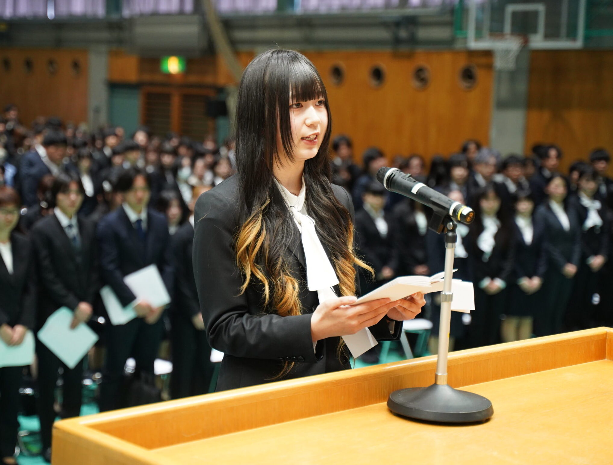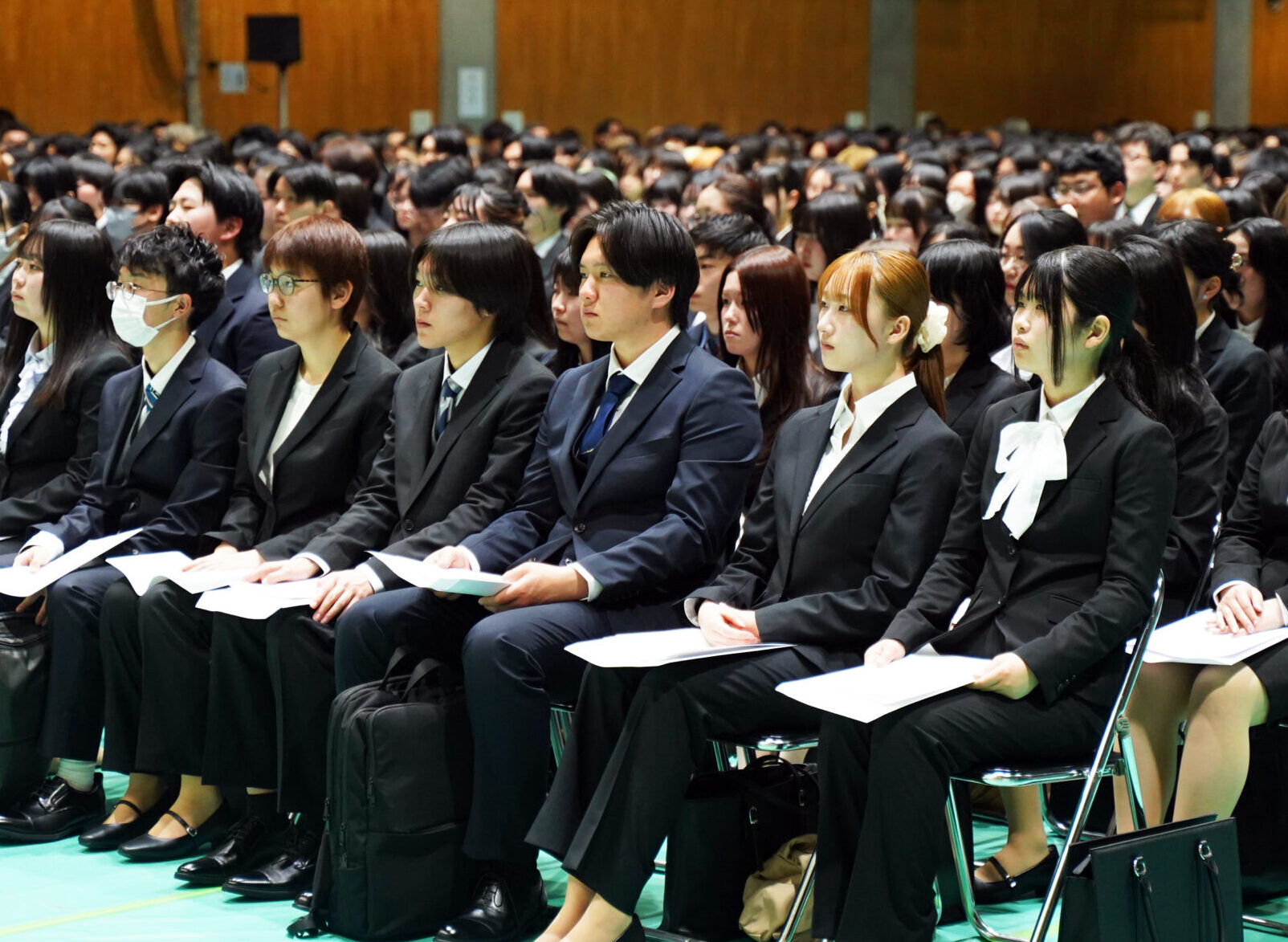 式が始まる前の会場には、少し緊張した表情の新入生たちの姿がありました。しかし式が進むにつれて、その表情は真剣さと期待に変わり、未来に向かう前向きな空気が広がっていきました。