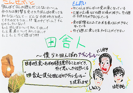 決勝大会出場が決定した時は、大変驚きました。提案書やパネルの制作では全く作業をせず、チームのメンバーには本当に迷惑をかけました。大会直前まで学校に夜遅くまで残り、プレゼンの練習に励みました。田んぼの撮影に協力してくれた方々や学校の友だち、本番まで支えてくれたスタッフのみなさんに感謝の気持ちで一杯です。改めて「感謝」という言葉の大切さを学びました。