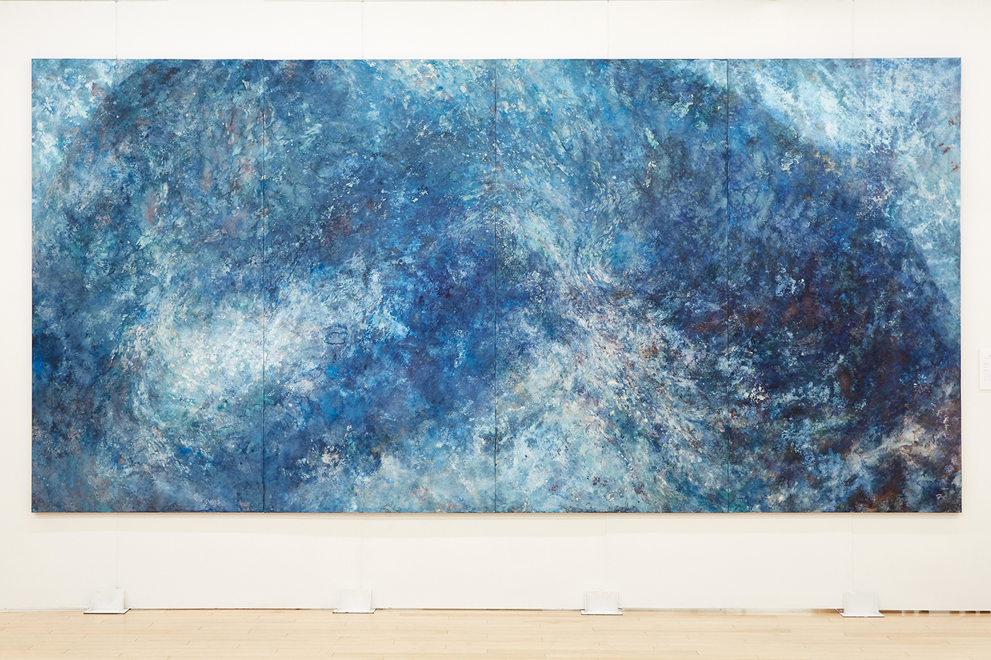 「生命の循環」をテーマにうねる海の世界を描きました。生き物は生命を取り込み、死骸は微生物によって分解され、粒子となって海へ還っていきます。私たちも同様に循環する自然の一部であり、私は海や鯨のように力強く大きな存在の一部になりたいと想うようになりました。そして、私に生きるエネルギーを与えてくれるものの呼吸や、鼓動、生み出される流動をイメージしながら、水の動きや滲みを用いて表現しました。