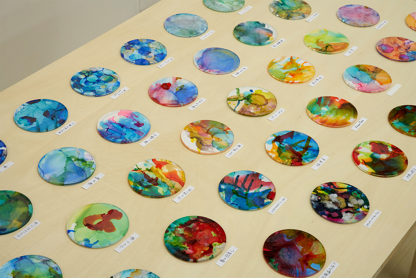 2011年に震災を経験し、ボランティアなどの地域活動を通して、海と向き合い続けた私に今できることは何か。そんな思いから行ったワークショップで、この作品は制作されました。海の思い出をテーマに色を選んで、色の重なりや広がりを楽しみます。記憶の中で儚くも輝くこの海が、あなたの歩む未来をやさしく包み込むものでありますように。