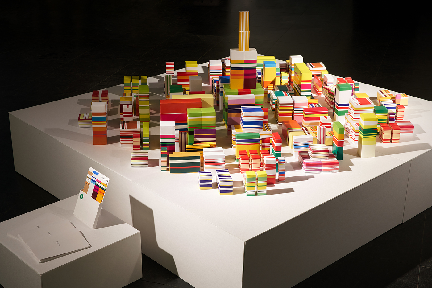 私たちはモノが持つ色情報でそれが何か無意識に判断しているということが多くあります。例えばケチャップは「赤いボディと白いキャップ」という印象を持っています。「Stripe city」はコンビニなどでよく見かける身近な商品の「印象」を抽出した立体を並べ、街に見立てた作品です。色の集合は様々なストライプとなって、鮮やかな街並みになりました。私たちが消費している商品でできた街は、私たちの生活そのもののようにも感じます。