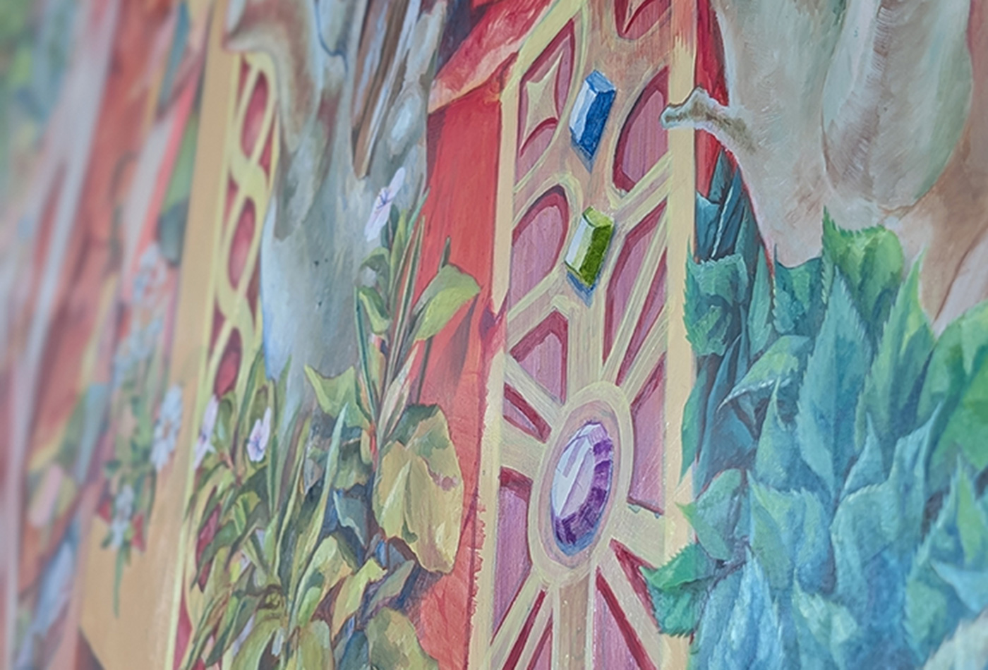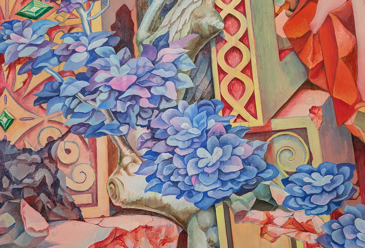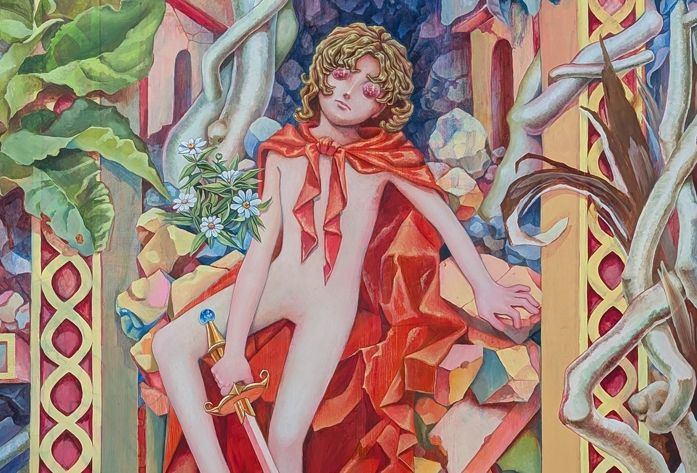 少女マンガを想起させる人物像と、象徴主義的な絵画表現が絶妙に融合した力作である。物語の主人公と架空の古代遺跡、そこに絡み合う植物が、周到に練り上げられた構図の中で共存している。建物や鉱物、植物、人物の瞳に至るまで、色彩が煌めき、まるでガラス細工や宝石でできた世界にも見える。本作には、これまで宮本さんが制作してきたドローイングや油彩によって培われた構成力と色彩感覚が見事に結実している。そして現実の場所やモチーフを取材した経験と丹念な描写が、空想の世界に深い真実味を与えている。