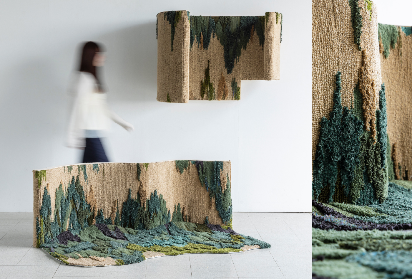 本作は、閉鎖的で圧迫感のある空間こそが、個人の居場所になり得るという着想から生まれた。森林の奥に佇む小屋や古城のように、密やかでありながらすべてを受け入れてくれるイメージをもとに、人体の構造にも着目しながらインテリアとしての可能性を追求している。作品は、人が立つだけで閉鎖空間のような錯覚を与える壁掛けと、ソファーの角に身体を預けた際の形状に沿う立体の2点で構成され、最小限の要素による洗練された造形が独特の存在感を放つ。表面にはハンドタフティング技法によるテキスタイルが施され、布を裂いて糸のように扱うことで、豊かな質感と世界観を生み出している。