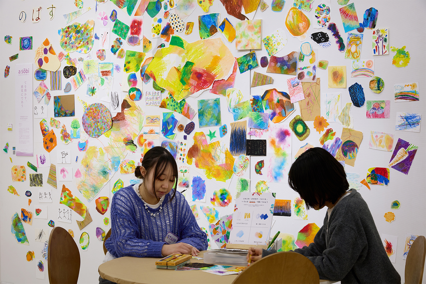 誰かと一枚の紙を囲んで、気ままな気持ちで描き始めた絵には思いがけない発見があります。授業で画材の面白さに触れる中で、クレヨンの色の伸びや重なりに魅力を感じ、ラフな自分の気持ちと照らし合わせてきました。誰でも一度は触れたことのあるクレヨンの面白さ、紙に色を塗り重ねる感覚を、同じ画面で触れて共有できたらと思い、この展示ができました。