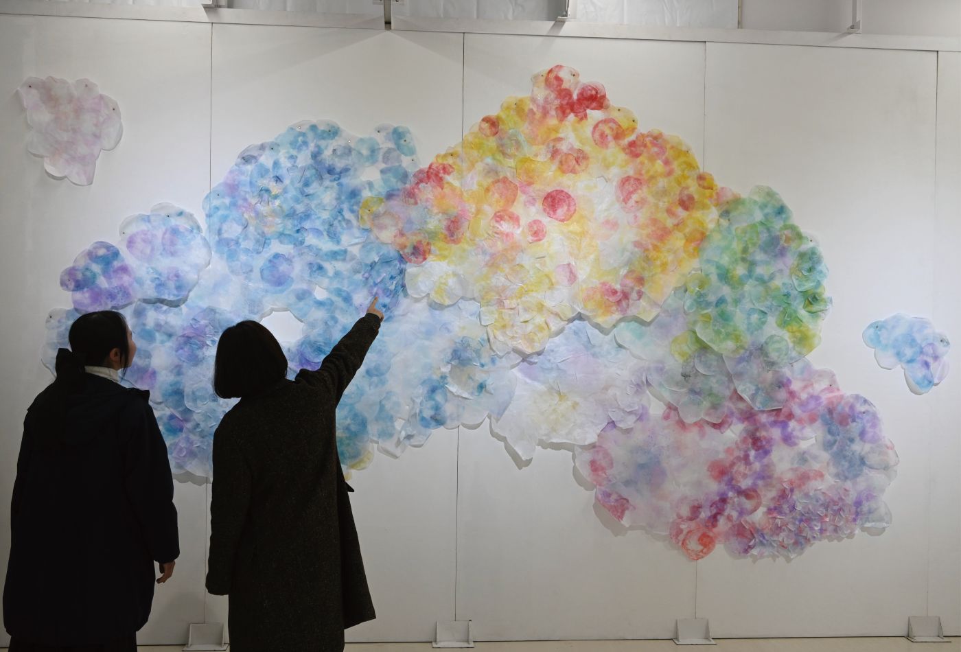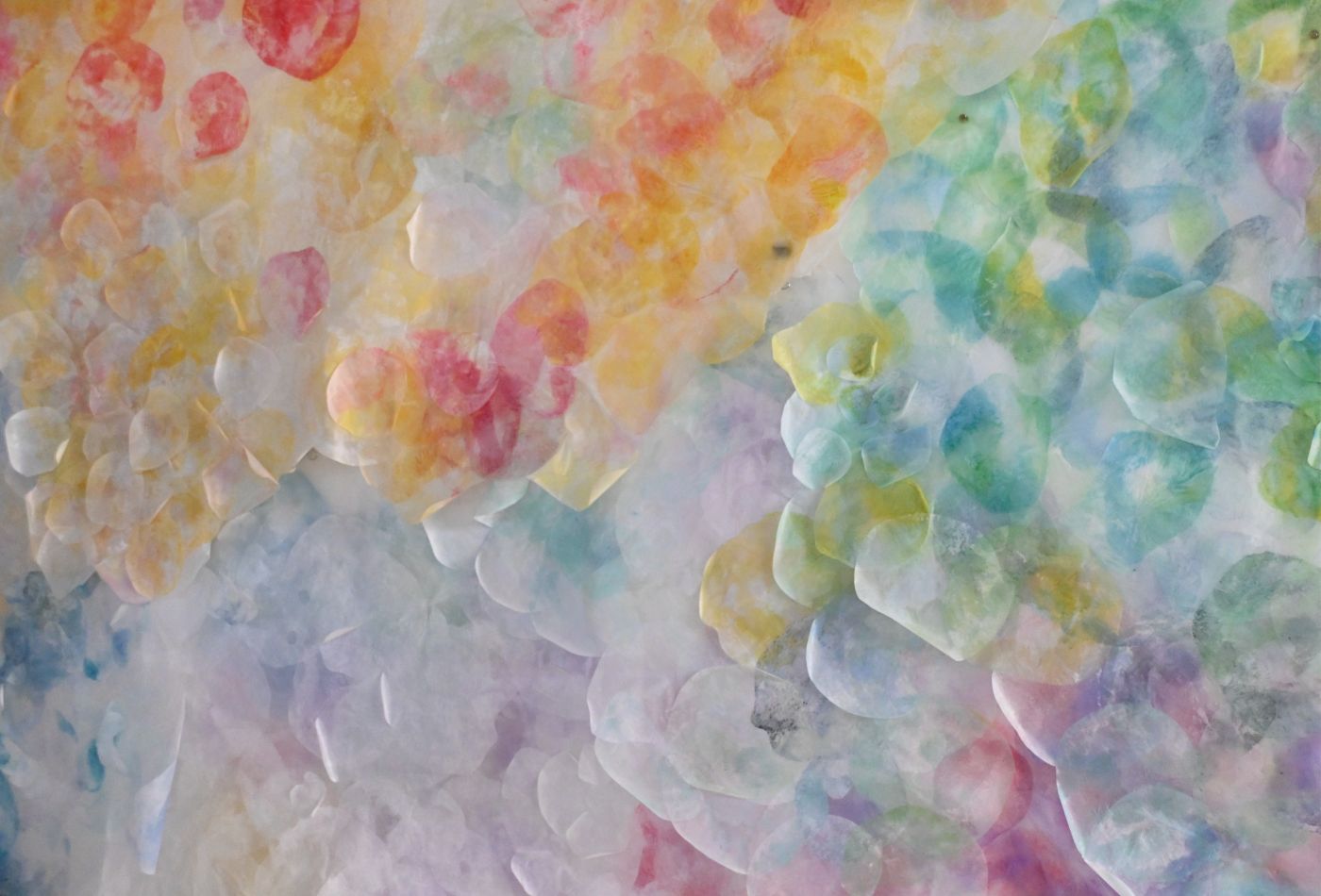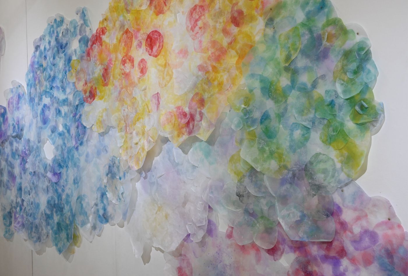 壁一面にさまざまな色の紙が不規則に重なり合いながら貼られている。半透明で繊細な色合いのその紙は重なることで色が混ざり合い、より複雑な表現を作り出している。雲のようでもあり、花のようでもある。