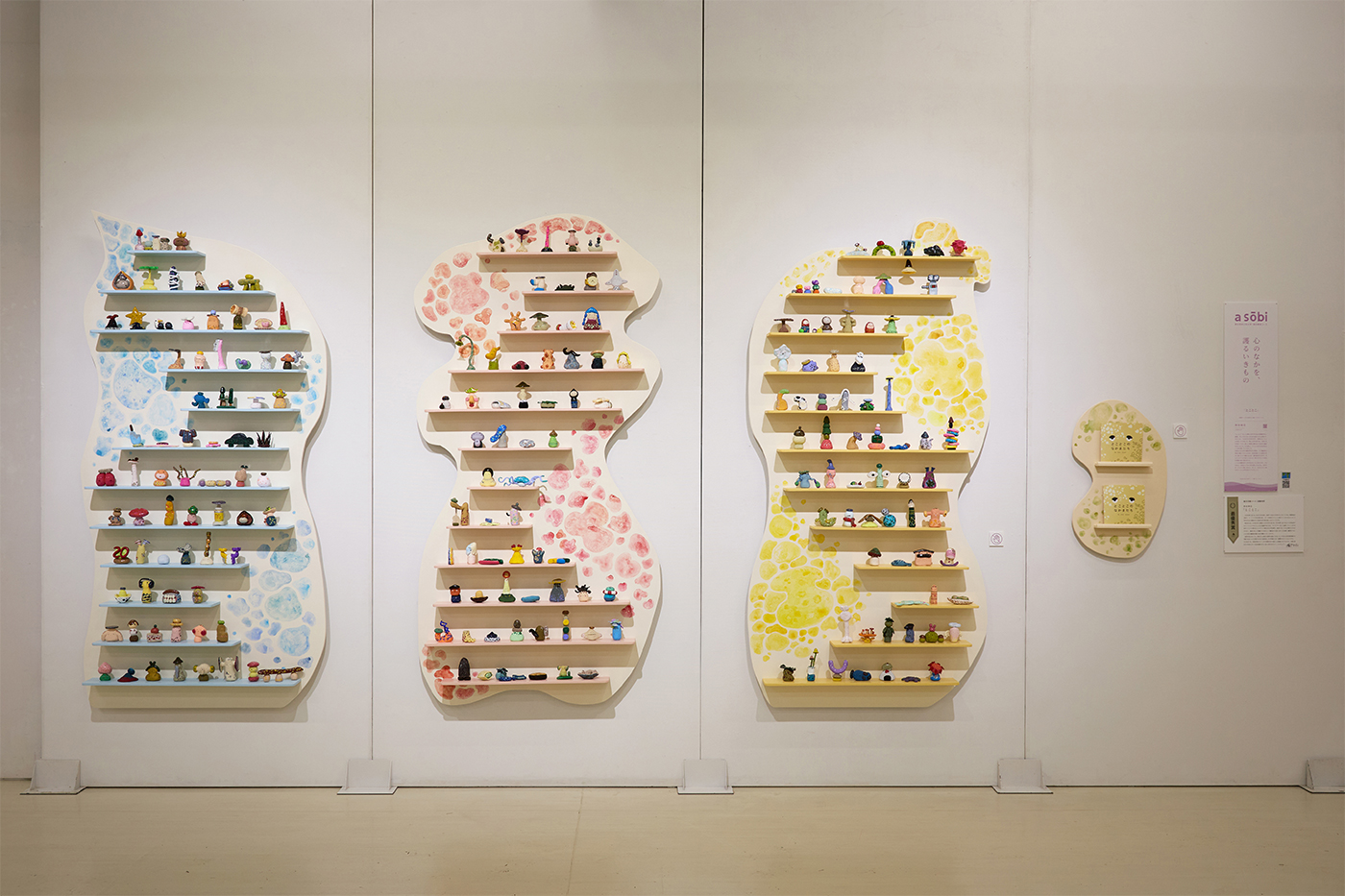野田さんは、2年次の早い時期からその学びに気づき、自分を深く見つめることを作品作りのテーマとしてきました。自己の感情や考え方を、キャラクター化して造形していく。その手法をこつこつと磨きました。そうして創出された作品群は、他者に対しての自己開示となるだけでなく、他者に対して内観をすすめるという働きかけも担います。その結果、鑑賞をすることで、作者と鑑賞者が様々な形で繋がっていくのです。