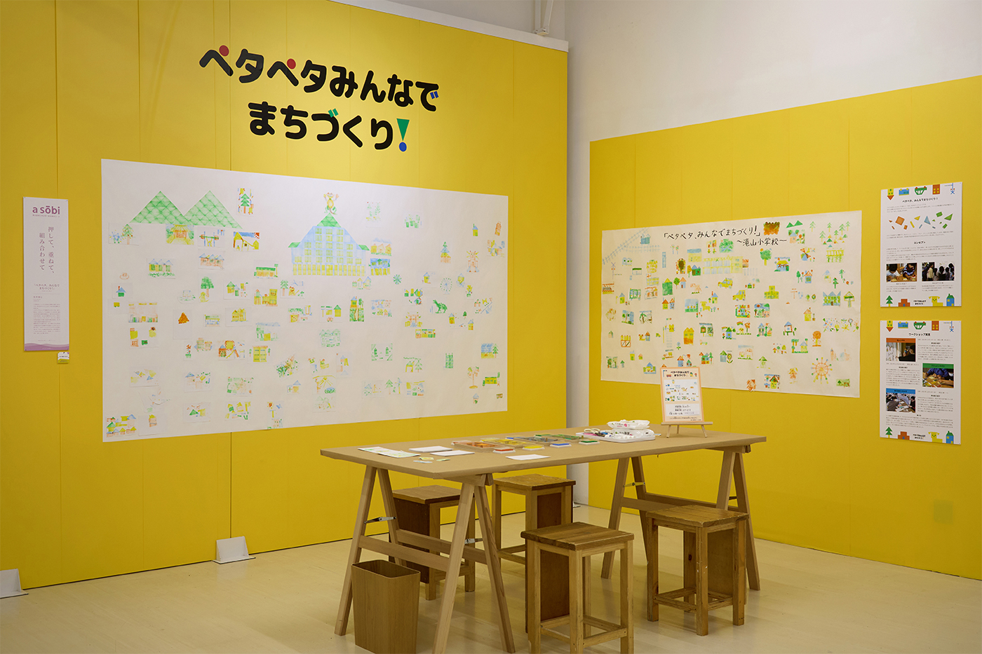 スタンプは工夫次第で多様な表現ができます。この作品は、そのスタンプを使ってワークショップの参加者と一緒に「まち」を制作しました。みんなで制作をすることで「それいいね」「どうやって作ったの?」と言った会話が生まれ、新たな視点や表現が広がっていきます。丸や三角などのシンプルな形のスタンプから何が作れるのかを考える面白さや人との関わりから生まれる表現の広がりを体験できる場をつくることを目指しました。