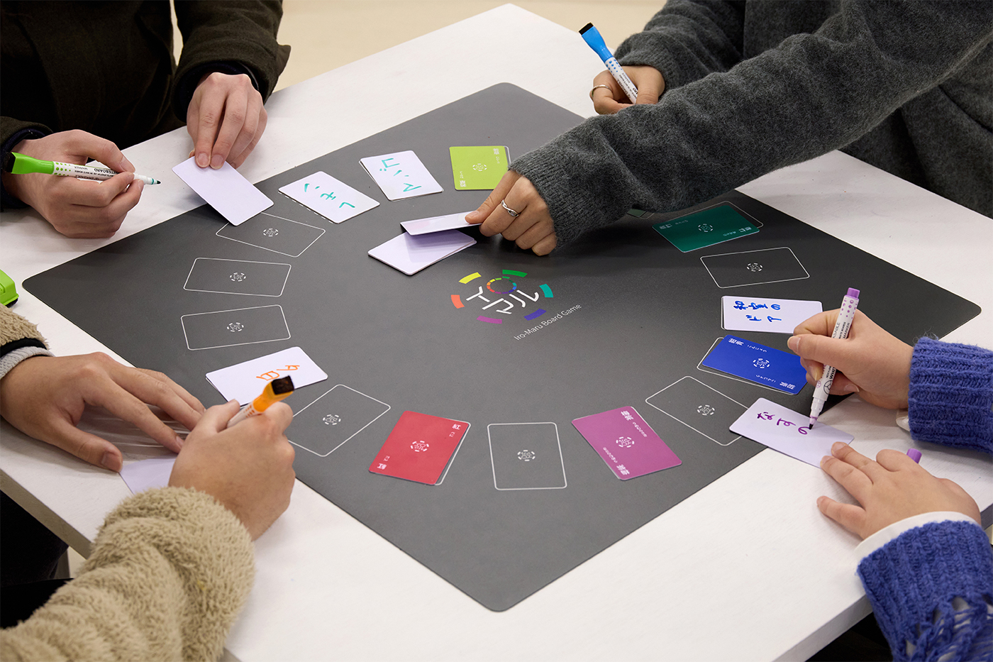 「イロマル」は、色に対する感じ方やイメージの違いを、楽しみながら共有するというコンセプトで制作したボードゲームです。本作では色の名前を使わず、例えや連想によって色を表現することで、プレイヤーそれぞれの感覚が自然と表に現れる仕組みになっています。認識のずれや感覚の違いに気づくこと自体も、このゲームならではの特徴の一つです。正解のない色遊びを通して、あなたの感覚を誰かと共有してみませんか。