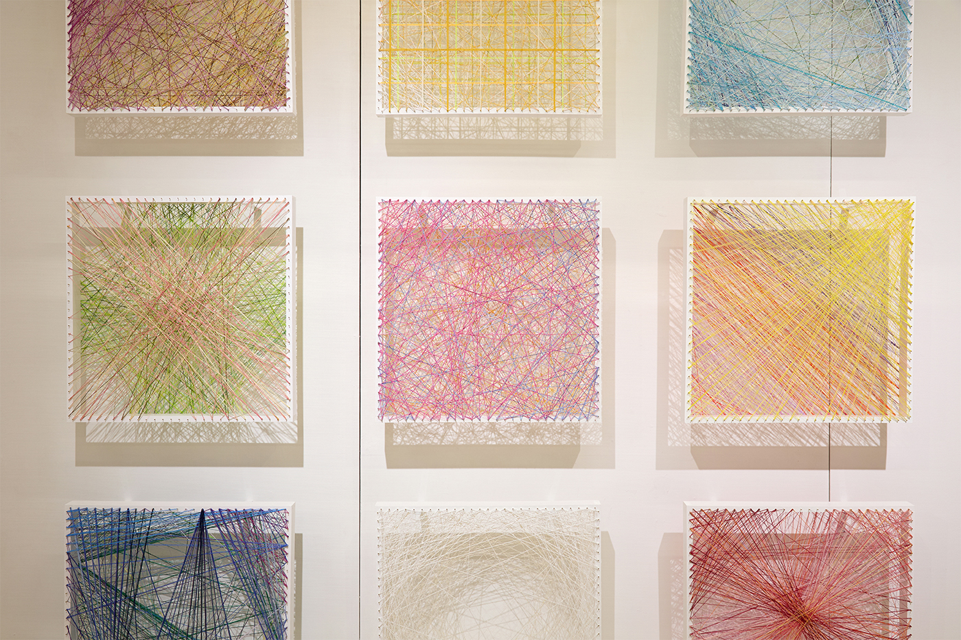 山本桜加|Color, and..鳥取県出身石沢惠理ゼミ550×550×75mm 刺繍糸/ミシン糸/真鍮釘/檜材