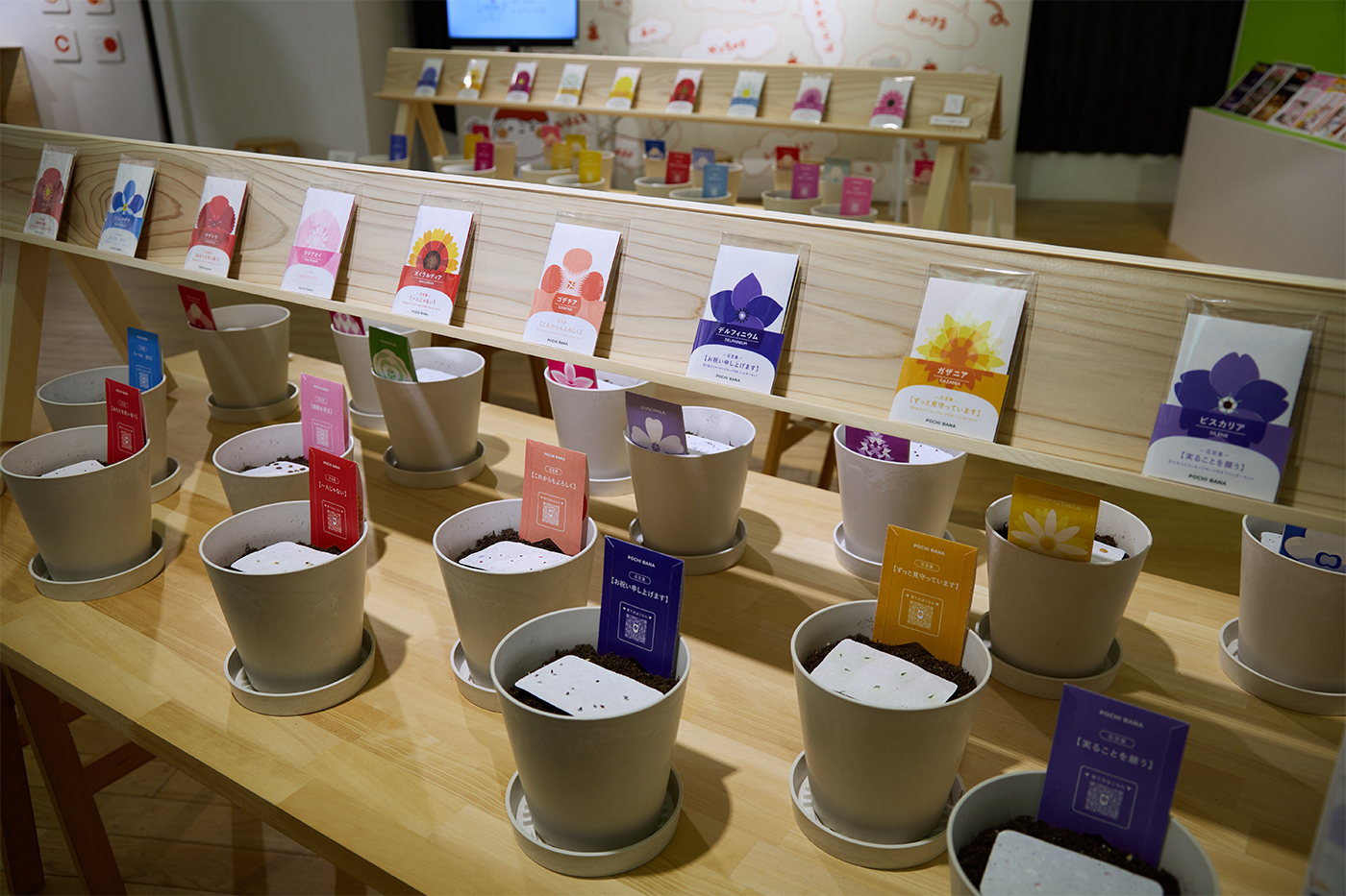 花と花言葉をあしらったポチ袋です。誰しも、日々の生活の中で身近な人に面と向かって伝えられない気持ちがあると思います。このポチ袋は、そんな気持ちをそっと花言葉とともに相手に伝えるための小さなツールです。同封されたメッセージカードは花の種が紙の中に入っているシードペーパーという素材で作られているので、カードを植えると花を咲かせます。また、ポチ袋は花を育てる際に鉢に差す園芸用の立て札としても使えます。