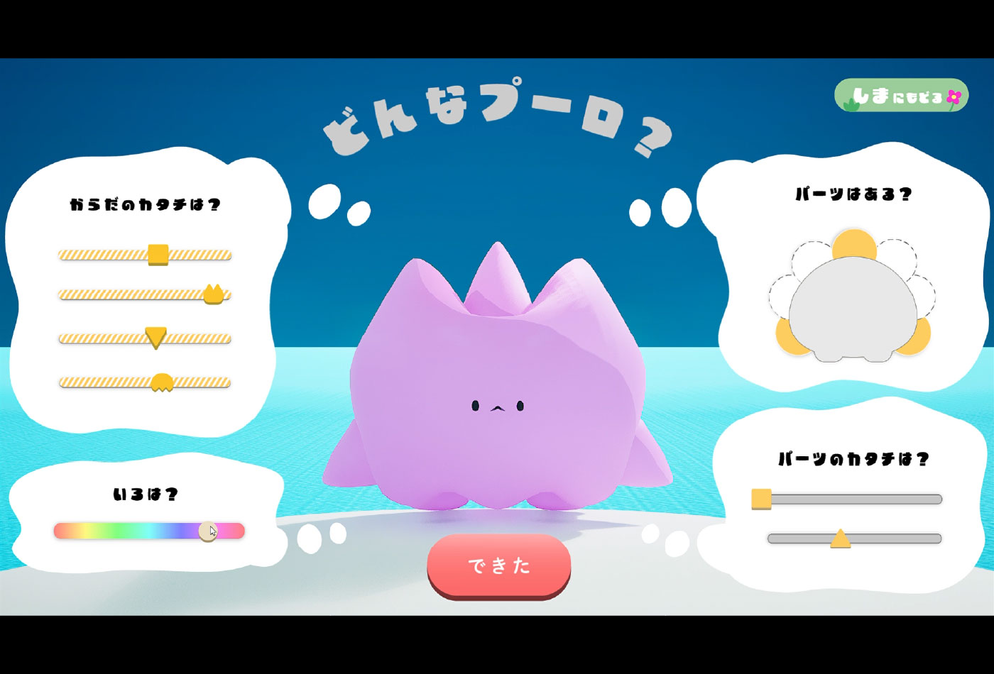 キャラクター「Puro」を用いて自分好みの「かわいい」を創り出すことのできる体験型の作品。色や形を自分好みに生成したPuroは自由に動き回り、十人十色のかわいいを共有し合うことができる。
