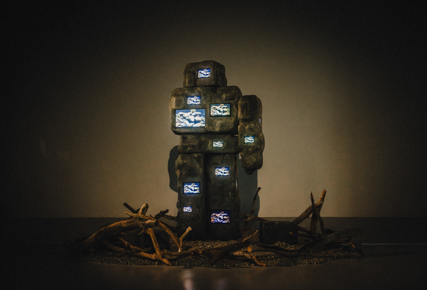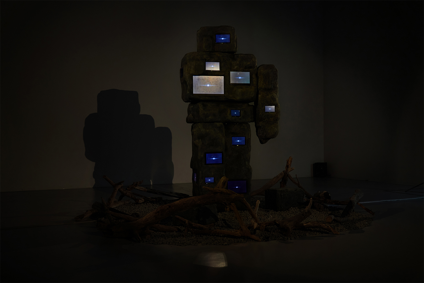 松浦虹太は、映像身体表現をベースに、人間の内的心理とメディアの関係性を探究してきた。映像と身体をめぐる継続的なリサーチと表現技法の実験を通して、彼が辿り着いたのは、「鎮座した石の身体オブジェ」と「流動する光」という相反する要素の結合である。本作は、2メートルを超える石の身体オブジェに20数個のモニターを埋め込んだ大型インスタレーションである。現実空間において身動きを封じられた石の身体は、内側に埋め込まれた映像世界の中で、思考のトライアンドエラーを繰り返しながら、終わりなき彷徨を続ける。物理的な拘束と精神的な解放。マテリアルの重厚さとピクセルがもたらす軽やかな運動。それらが交錯する境界で、観る者はどこか知らぬ地を歩み続ける思考の運動を目撃することになる。誰も到達したことがない未開の地へ彼は今日も歩み続けるだろう。