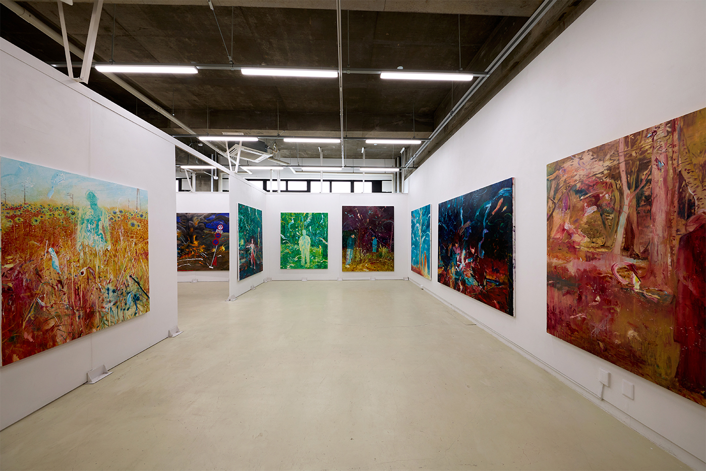本展示では、「人物が融合する風景」を主題に、自然の中で出会う人々と、その場に残る記憶の気配を絵画として提示する。山や空、といった自然物に加え、風や光といった現象をストロークとして重ねることで、精神の揺らぎや時間の流れを画面上に立ち上げている。炎や星空など、刻々と変化する自然の姿を通して、人と風景が交錯する一瞬を捉え、抽象性と勢いを伴った画面構成を追求した。