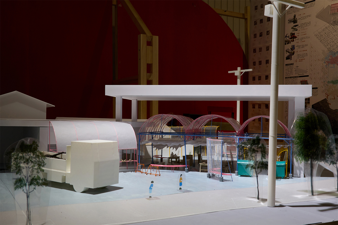 減少するガソリンスタンドを「運動の低迷」と捉え、給油中心の車の流れだけでは起きない変化を、人の小さな行為(の連鎖として立ち上げる研究。屋根・柱・硬いフィールドと分布特性を手がかりに周辺の営みを採取し、古材とビニールハウスパイプの仮設挿入で制度の限界線を露出しつつ、資源循環とモビリティが更新される中動態的地域ノードへ再編集する。