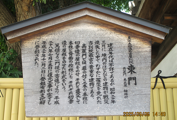 現地調査の結果、全体の設置率は36.9%と低い水準であることが明らかになった。調査対象とした全ての文化財建造物に解説案内板が設置されているわけではなく、住宅やオフィス、料亭などの本来の用途で使用されている建造物、非公開または特別公開時のみ公開される建造物において設置されていない事例が多く確認された。また、調査対象となったほとんどの解説案内板には設置年の記載がなく、正確な設置時期を特定することは困難であった。この点は、維持管理を行っていく上で大きな課題であると考えられる。 考察として、現地調査で撮影収集した解説案内板について表記法、文体などの組み合わせを基準にタイプ分けを行ったところ、各タイプに一定の傾向がみられた。たとえば、日本語が縦書き・常体(である調)で記されている解説案内板は、社寺を中心にみられ、仏教や建築様式に関する専門的な用語が多く含む内容であった(図2)。一方、近年設置されたと考えられる解説案内板では、日本語が横書き・敬体(ですます調)で表記され、英語解説が併記されたタイプが多く確認された(図3)。以上のことから、解説案内板は全ての文化財建造物において設置が適切であるとは限らず、文化財の公開状態や所有者の意向に応じて柔軟に検討していくことが求められる。