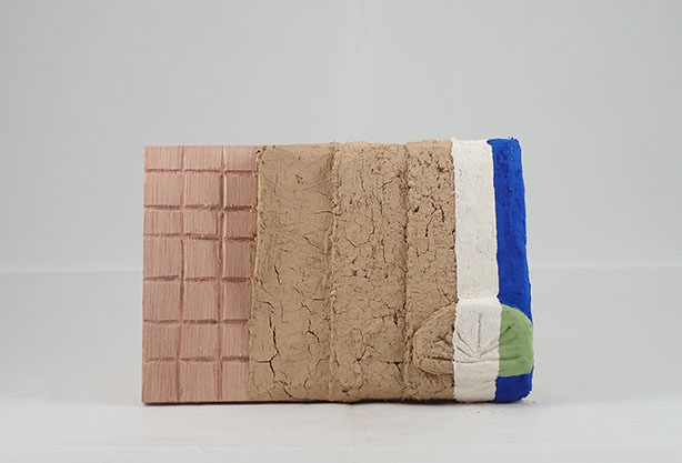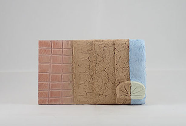 手板の制作は聞き取り調査を行った青木氏から分けていただいた土や漆喰を用いて行った。青木氏に見本となる手板を制作していただき、そちらの制作手順に倣って簡易的なものを制作した。見本の手板にはなかった彩色に関しては、顔料と糊による彩色(図2)と色漆喰(図3)による彩色の2種類を行った。