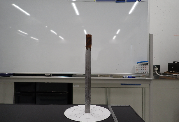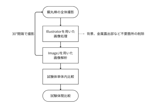 実験では、直径19 mm、長さ280 mmの鋼材磨き丸棒にモルタルを打設した試験体を複数作成し、湿潤乾燥サイクルによる劣化促進試験を行った。湿潤には水道水と3%塩化ナトリウム水溶液の二つの環境を用意し、24時間の浸水(図1)、48時間の乾燥を行った。各試験体にあらかじめ設定した回数の湿潤乾燥サイクルを行い、試験後モルタルを除去しサイクル数の増加に伴う腐食の進行傾向を観察した。評価観察は目視観察、マクロ撮影画像による腐食分布評価、画像解析ソフトを用いた定量化を実施した。(図2,図3) 結果、サイクル数の増加に伴い腐食は進行したが、その増加は環境条件によって大きく異なることが明らかとなった。塩水環境ではサイクル数の増加に伴い深部まで腐食が継続して進行したのに対し、水道水環境では表層から10mm以下で飽和する傾向を示した。特に下方向や側方で腐食が進行しやすい傾向が確認された。腐食分布は一様ではなく、方向性や局所的な集中が確認され、乾燥時の気流による影響が内部の腐食に大きな影響を与えることを示唆した結果が得られた。