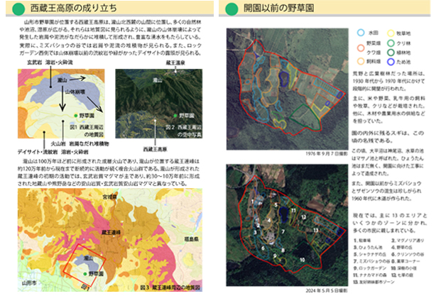 地理的な特徴として、瀧山の山体崩壊によって発生した岩屑や泥流がなだらかに堆積した地形に位置する。岩屑や泥流にしみこんだ雨水が豊富な湧水となり、自然林や池沼、湿原を形成した。これらの特徴が、野草園のシンボルである1万株のミズバショウとザゼンソウを育み、野草園設置の背景となったと言える。空中写真を整理すると、荒地と広葉樹から田畑と果樹、針葉樹へと人の手が入り、この過程で野草園の輪郭が形成された。開園以前を知る元職員への取材から、この頃の土地利用は、水田とため池、野菜や果樹、飼料などの畑、植林地や薪炭林であったという。