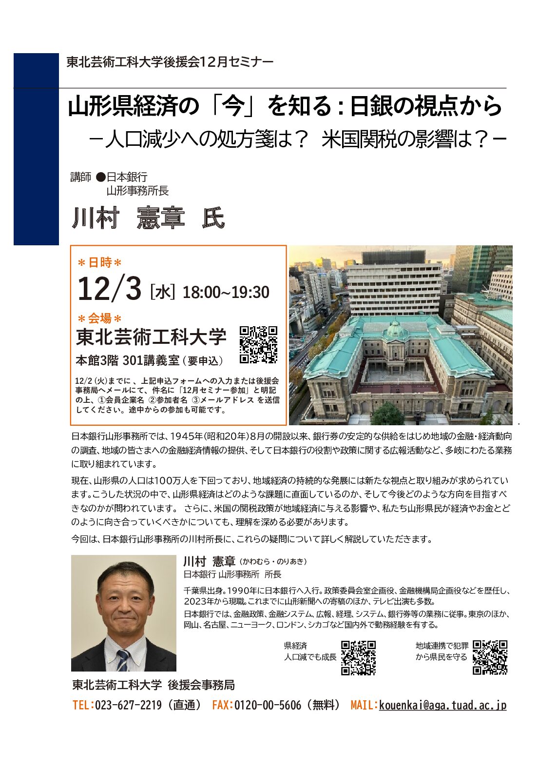 今年最後となる12月のセミナーでは、日本の中央銀行として経済と金融の安定を支えている日本銀行より、山形事務所長の川村憲章氏を講師にお迎えし、ご講演いただく運びとなりました。