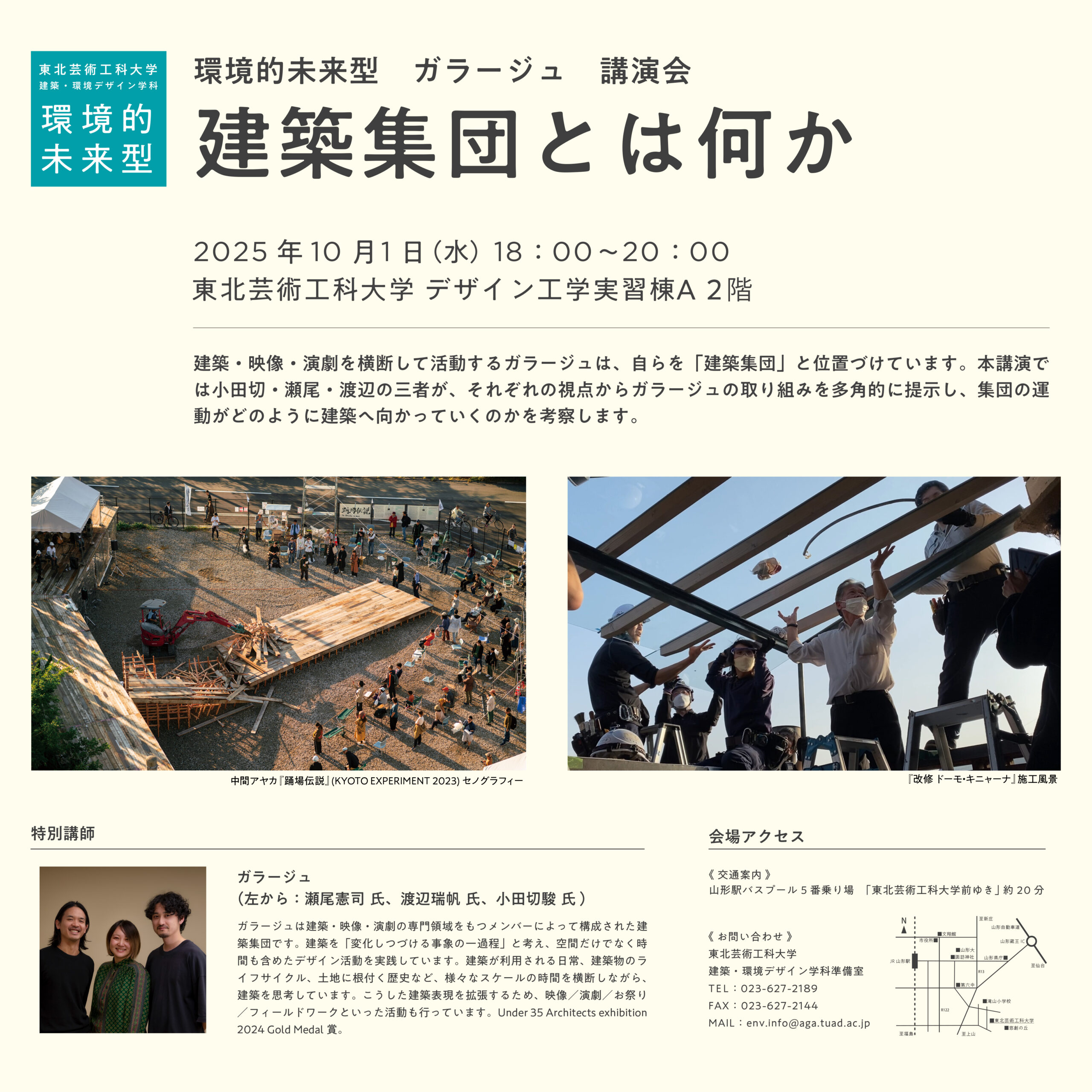 建築・環境デザイン学科主催の講演会「環境的未来型 ガラージュ特別講演会」が、10月1日(水)に本学デザイン工学実習棟で開催されます。