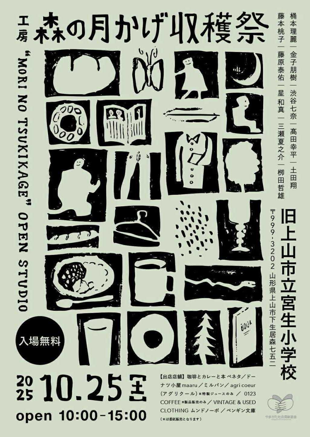 本学の教職員や卒業生が2015年4月より、廃校となった旧上山市立宮生小学校を、市の協力の下、共同アトリエ「工房 森の月かげ」として運営しています。そのオープンスタジオとなる「工房 森の月かげ 収穫祭」が、10月25日(土)に開催されます。