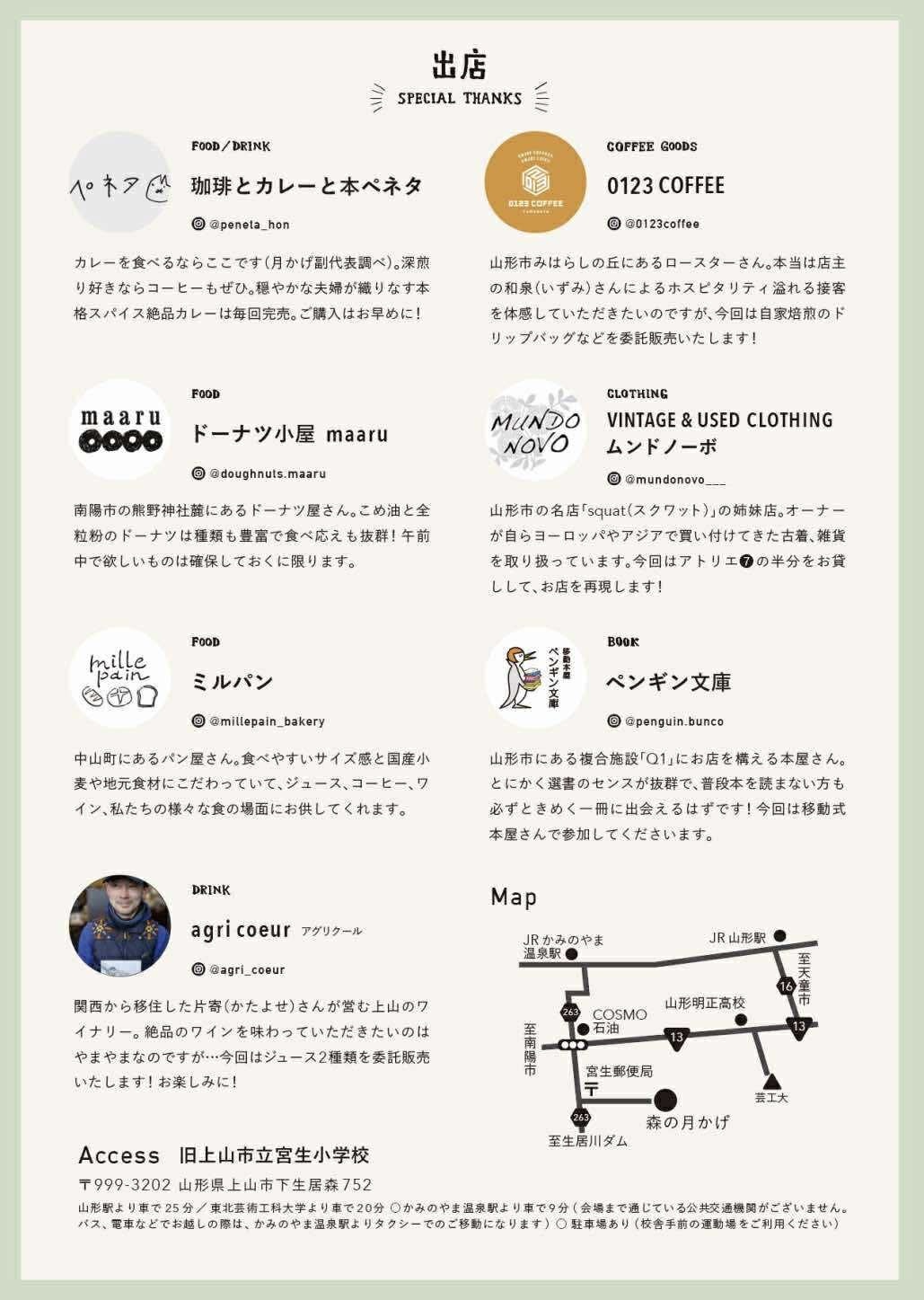 当日は、様々な山形県内の店舗によるご出店や、体育館にて上山市の音楽家 伊藤萌(めぐみ)さんら3名によるプチコンサート、芸工大総合美術コース学生によるご家族向けのワークショップを開催予定です。