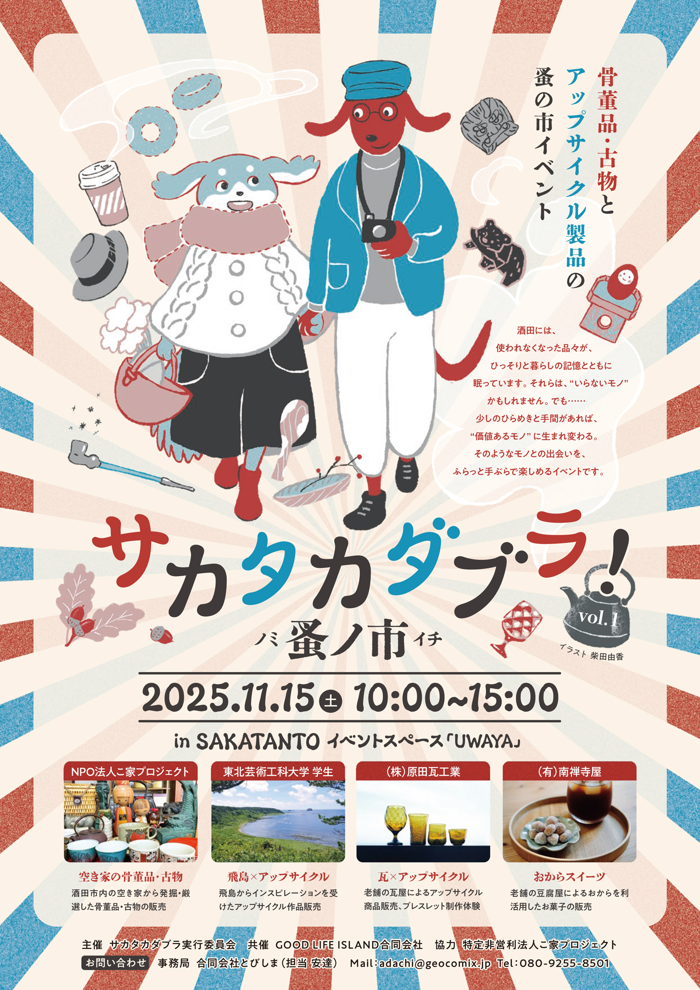このイベントは、骨董品・古物とアップサイクル製品の蚤の市で、当日は学生たちが飛島の自然や文化からインスピレーションを受けて制作した作品が並びます。