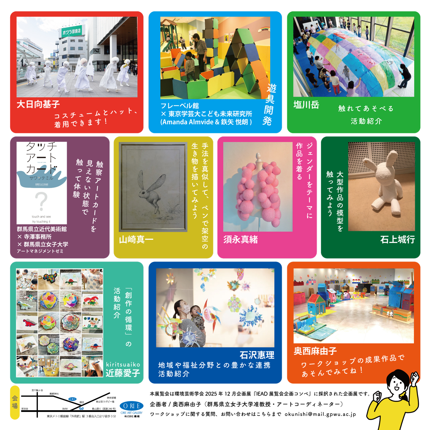 美術科 総合美術コースの石沢惠理(いしざわ・えり)准教授が、12/2(火)から東京・北青山のオリエ アート・ギャラリーで開催される「IEAD企画展『みる×つくる×あそぶ展』」で、地域や福祉分野との連携活動紹介の展示を行います。
