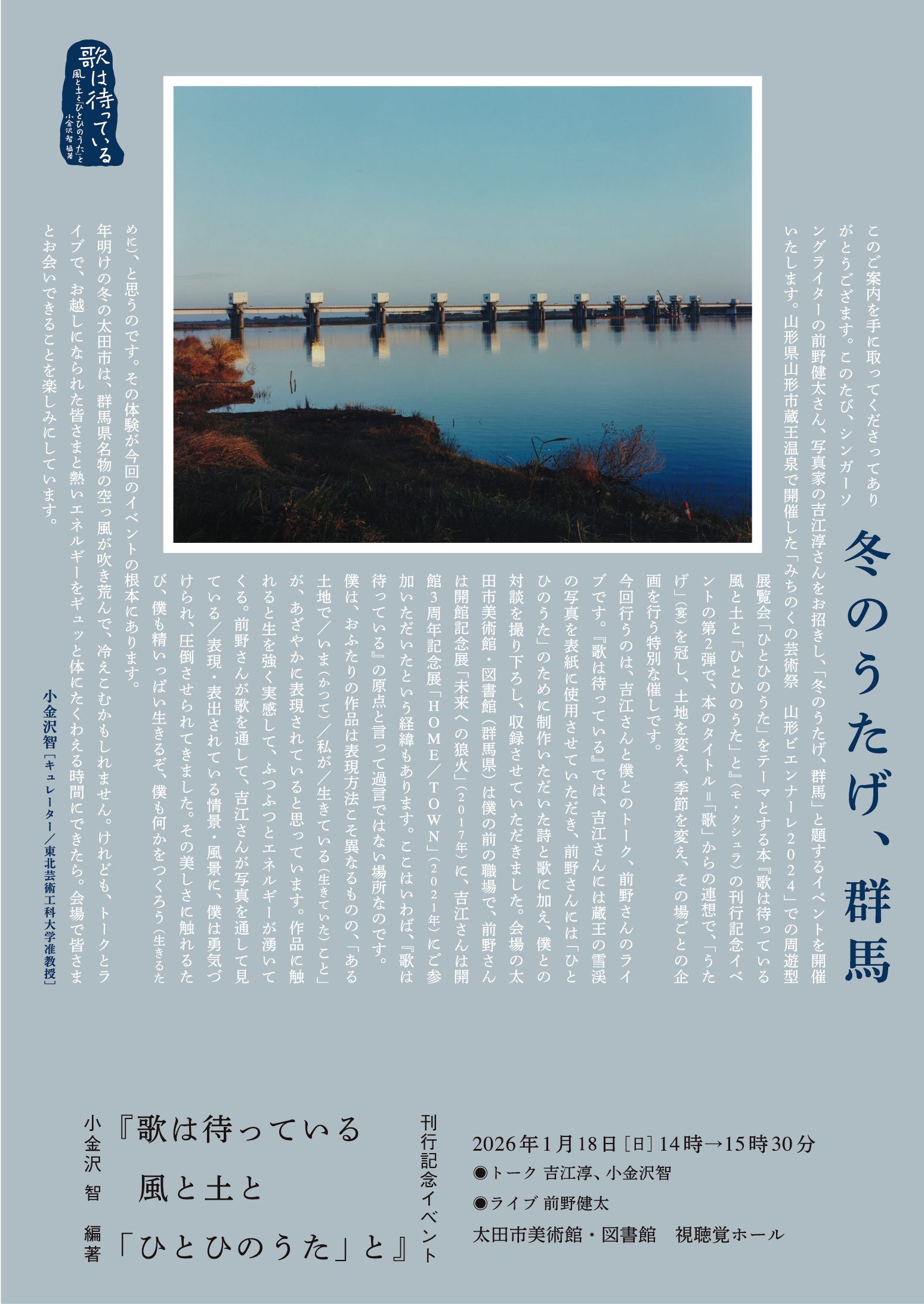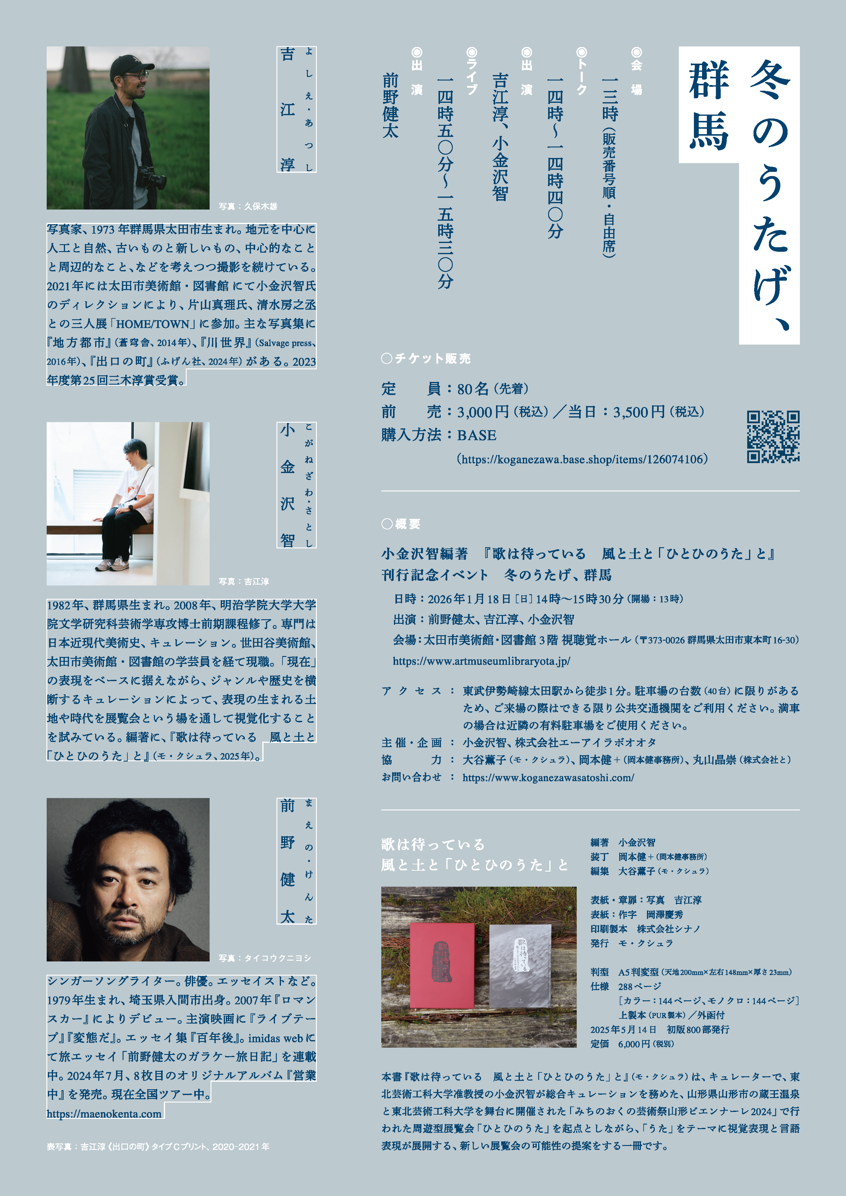 このたび、シンガーソングライターの前野健太さん、写真家の吉江淳さんをお招きし、「冬のうたげ、群馬」と題するイベントを開催いたします。山形県山形市蔵王温泉で開催した「みちのくの芸術祭 山形ビエンナーレ2024」での周遊型展覧会「ひとひのうた」をテーマとする本『歌は待っている 風と土と「ひとひのうた」と』(モ・クシュラ)の刊行記念イベントの第2弾で、本のタイトル=「歌」からの連想で、「うたげ」(宴)を冠し、土地を変え、季節を変え、その場ごとの企画を行う特別な催しです。