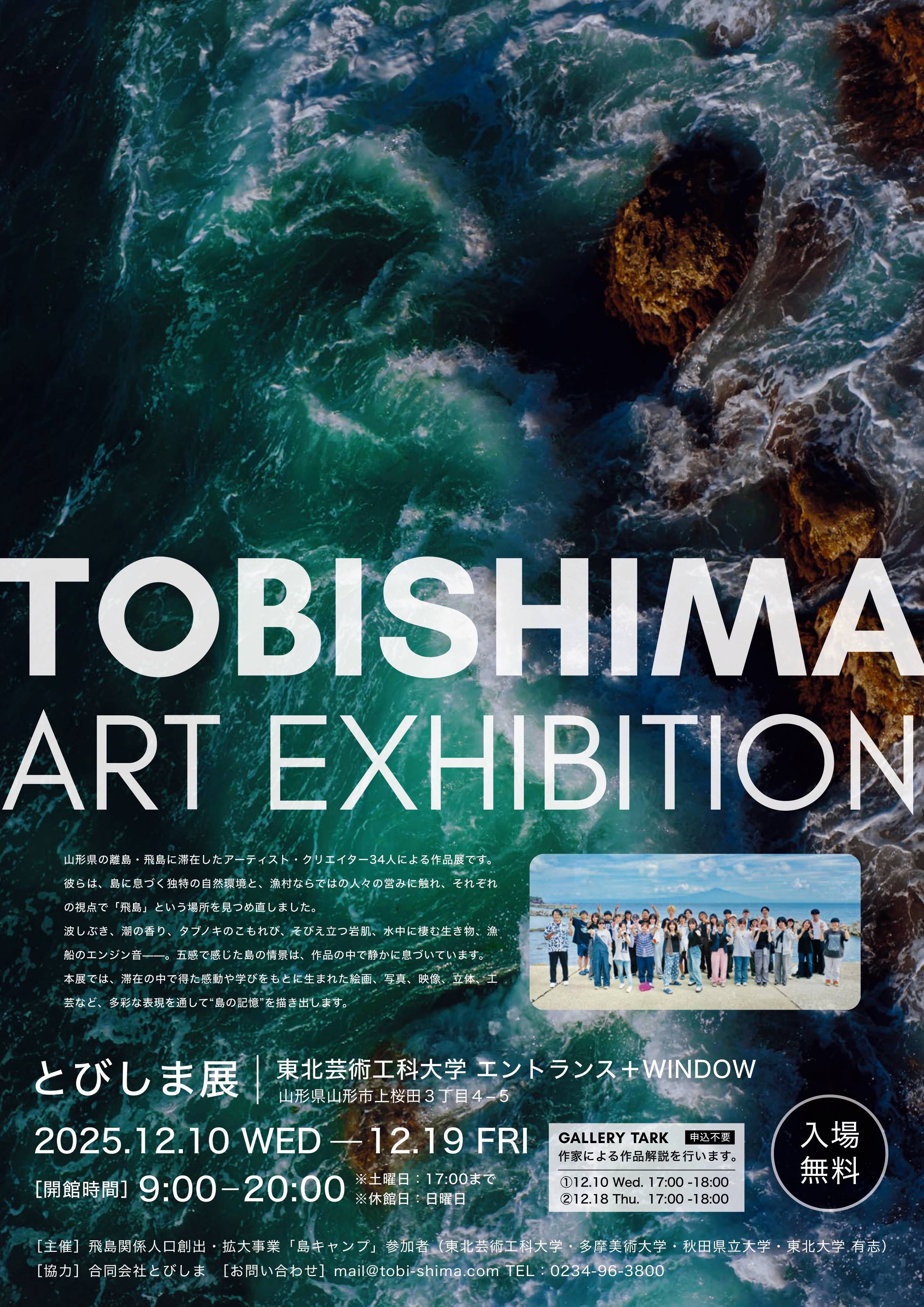 本学の学生有志7名がコーディネーターを務め、複数の大学の学生有志が参加した「島キャンプ」の活動成果を報告する展示会「とびしま展|TOBISHIMA ART EXHIBITION」が、本館1F TUAD WINDOWと本館1F エントランス南で、12/19(金)まで開催されています。