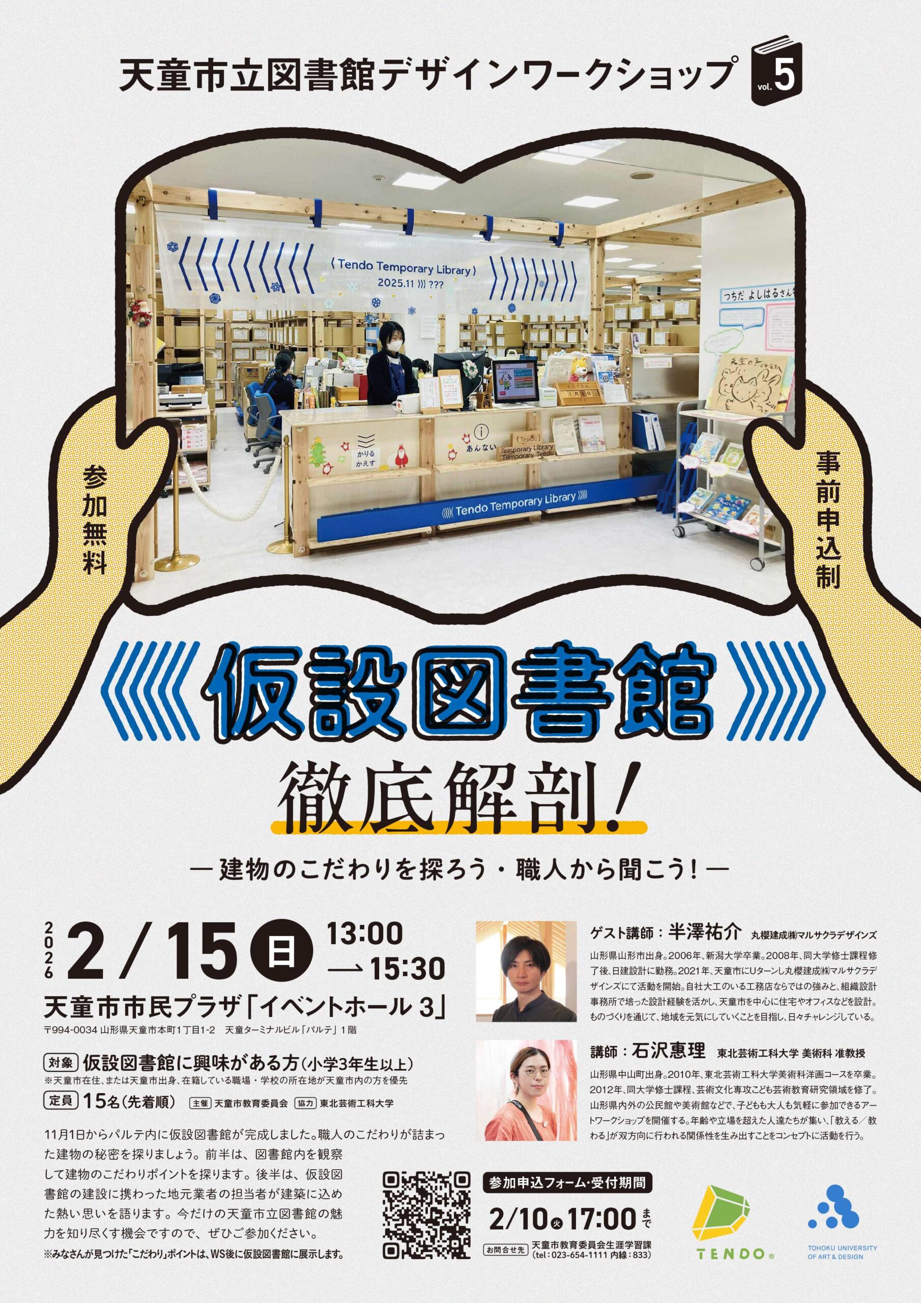 美術科 総合美術コースの石沢惠理 准教授が講師を務める、天童市立図書館デザインワークショップ「仮設図書館 徹底解剖!-建物のこだわりを探ろう・職人から聞こう!-」が2/15(日)に開催されます。