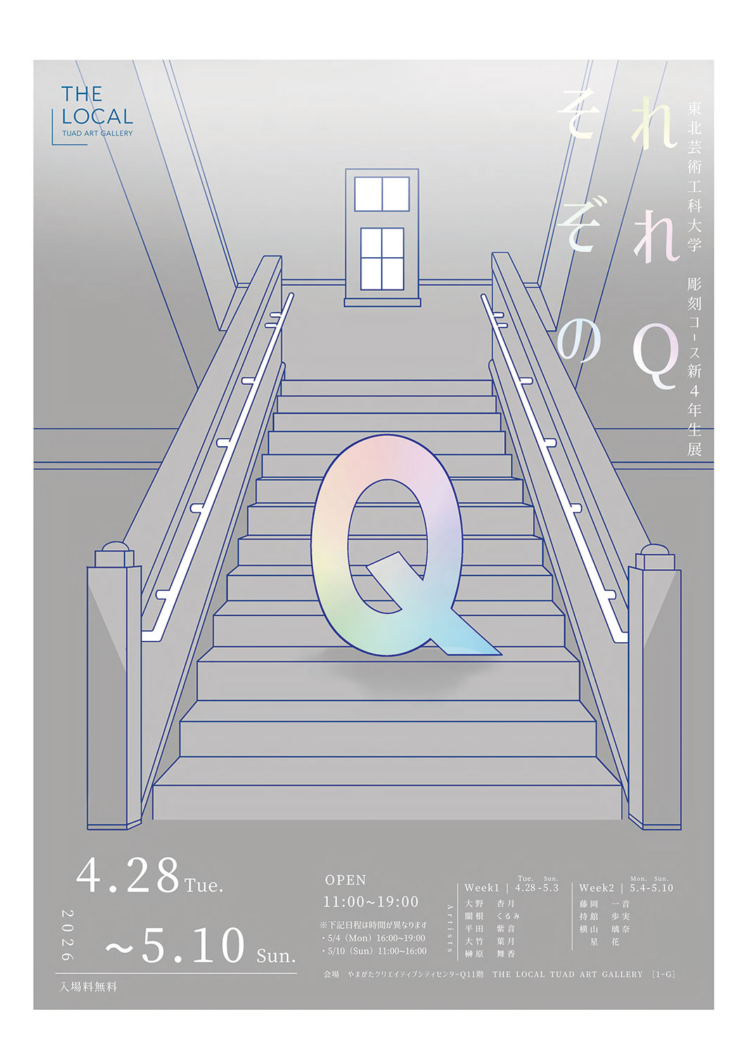本学が「やまがたクリエイティブシティセンターQ1」内に開設しているレンタル・ギャラリー「THE LOCAL」で、美術科彫刻コースの4年生 9名による展示「それぞれのQ」が4月28日(火)より開催されます。是非、足をお運びください。