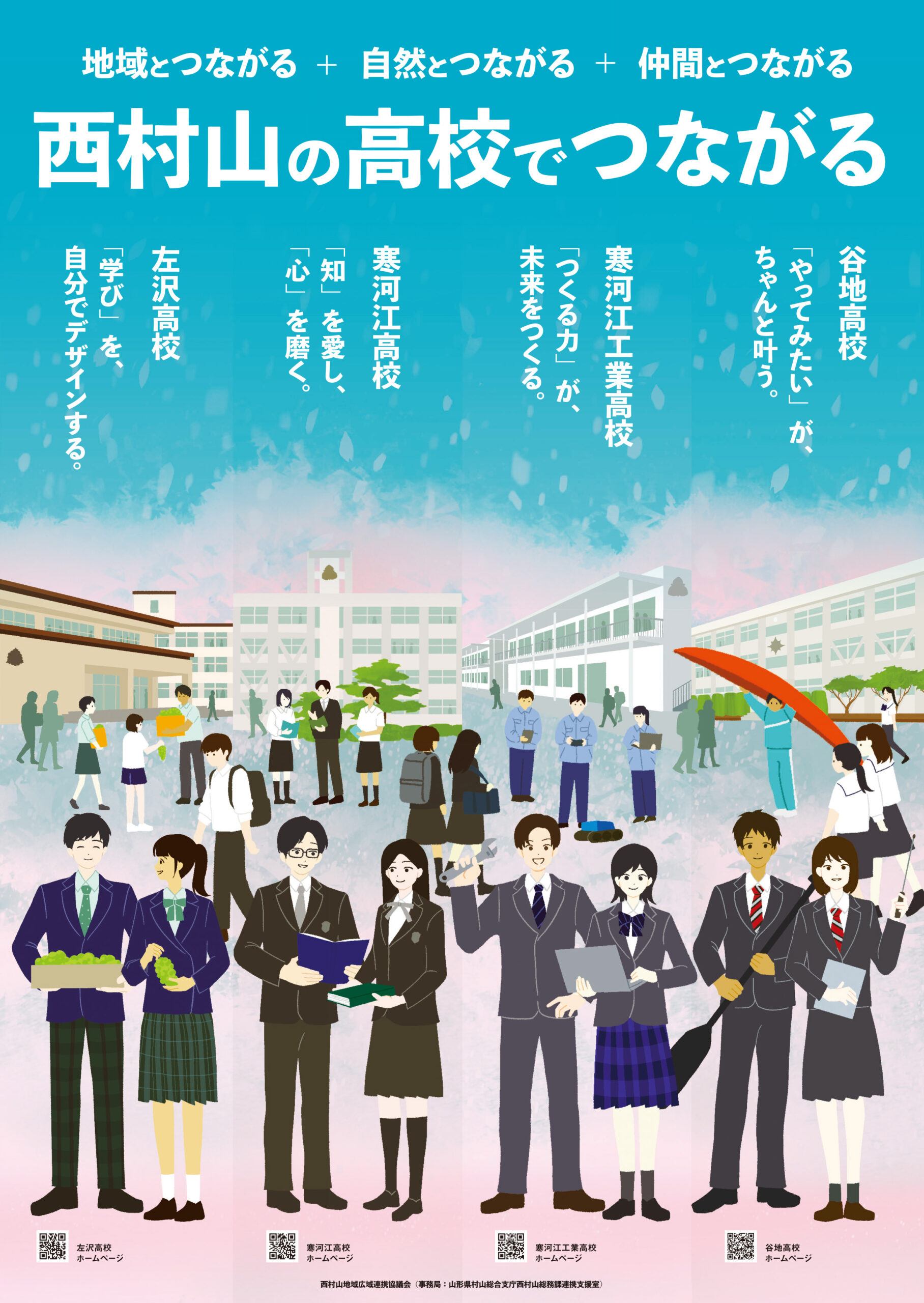 本ポスター制作は、西村山地域広域連携協議会(※1)からの連携依頼により実現したもので、山形県西村山地域(寒河江市、河北町、西川町、朝日町、大江町)の将来の担い手となり得る西村山県立4高校(※2)への入学者を増やすため、中学生や保護者、中学教員などに4高校の魅力を伝え、進学先として選んでもらうことを目的としています。