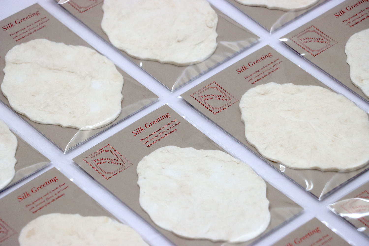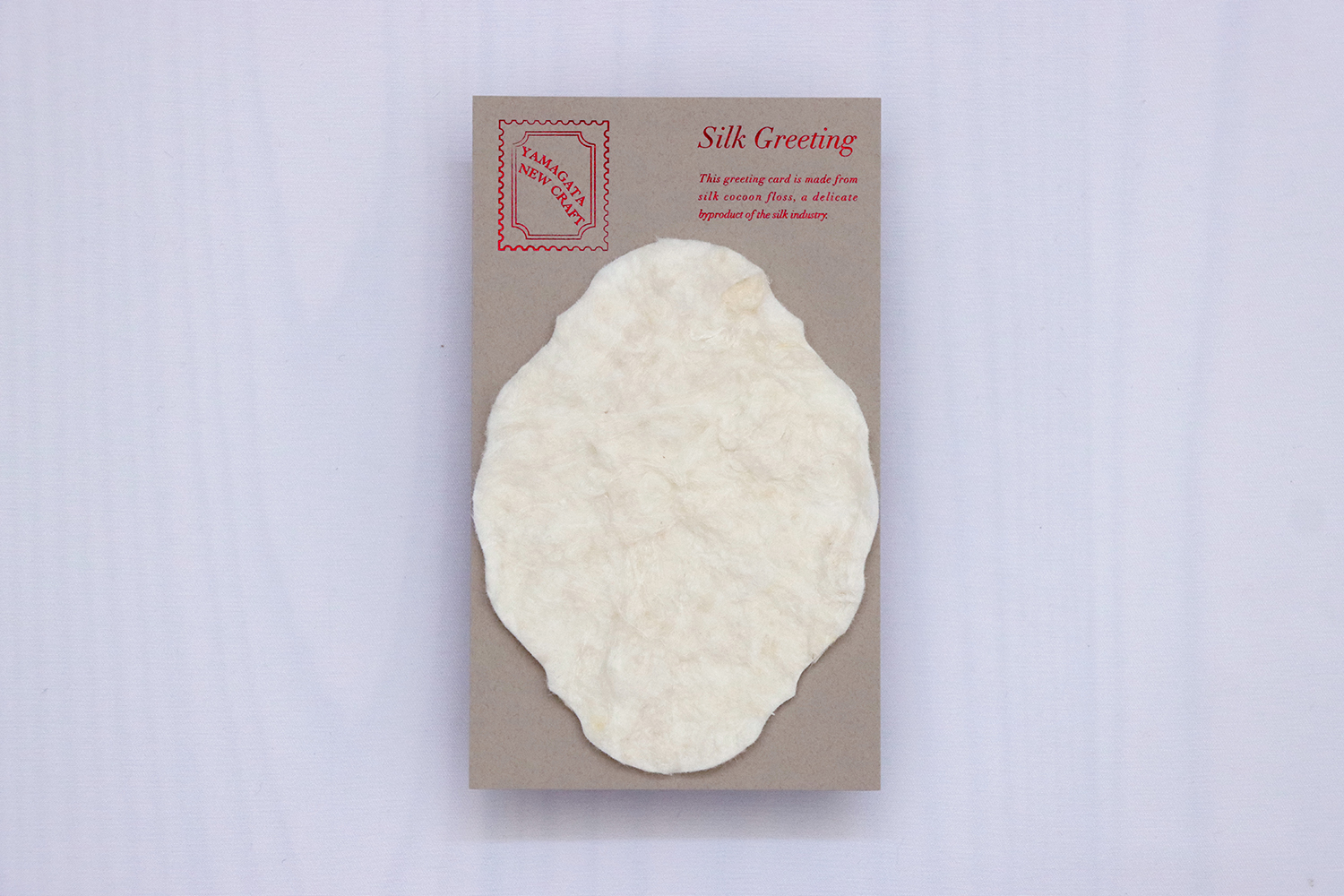 繭毛羽は、着物の原料となる絹糸を生み出す過程で生まれる素材であり、これまで十分に活用されてこなかったものです。これを活用したグリーティングカードは珍しく、山形の養蚕文化と紙もの文化をつなぐ新たなプロダクトです。