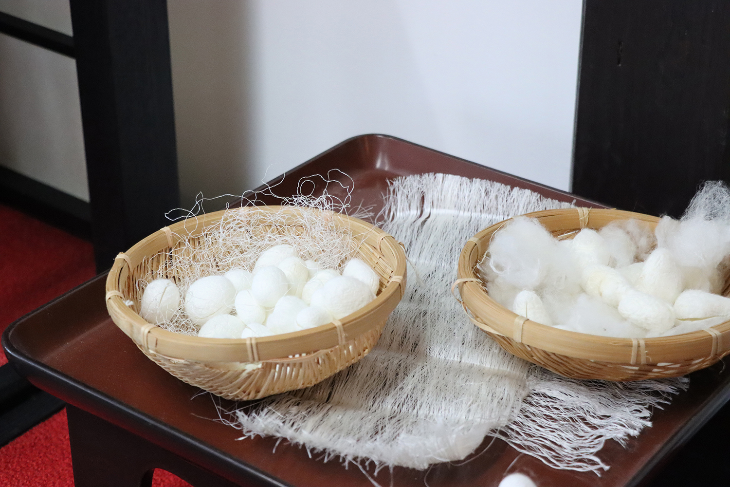 【特徴】・シルク産業の副産物「繭⽑⽻*」を活⽤したアップサイクル素材