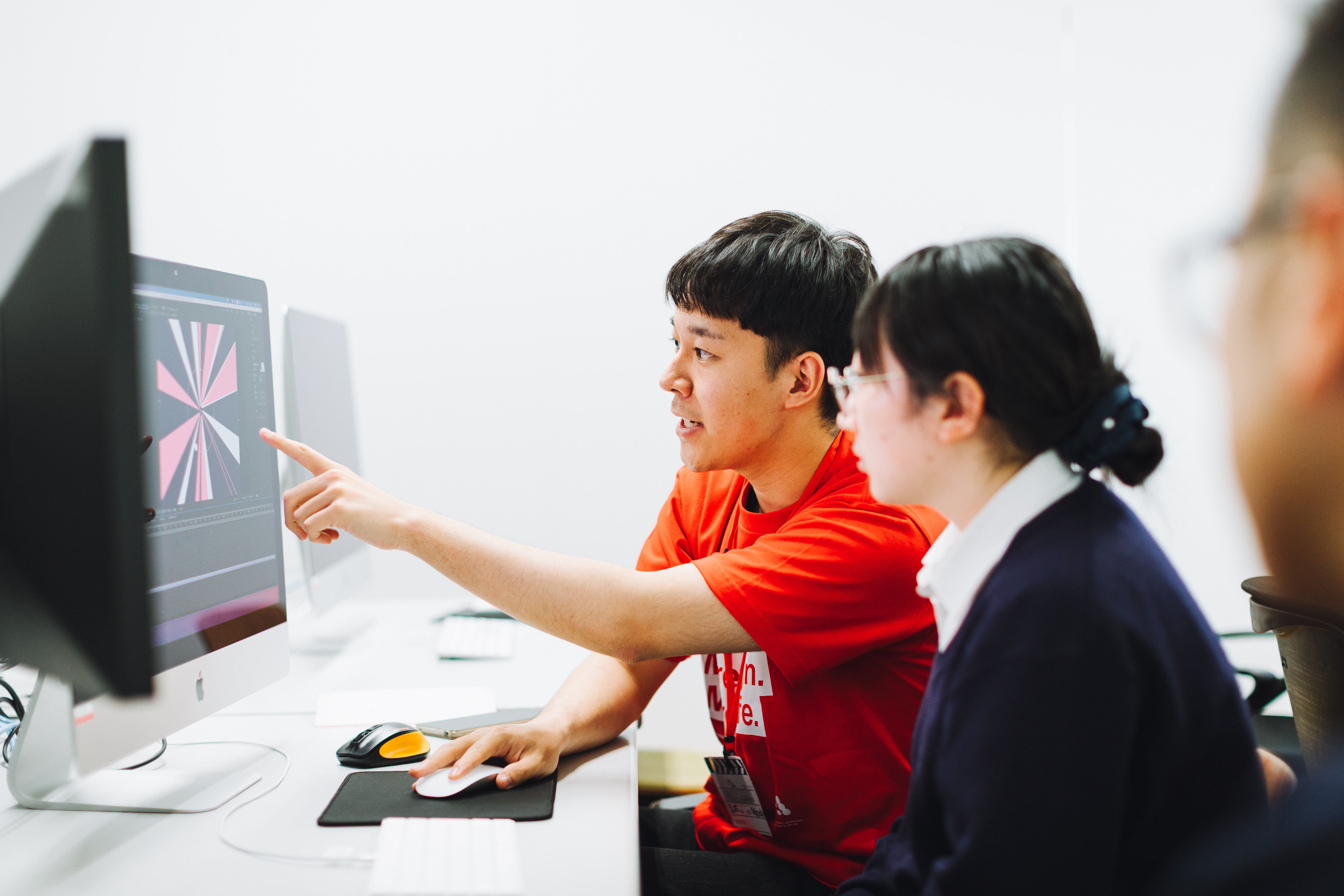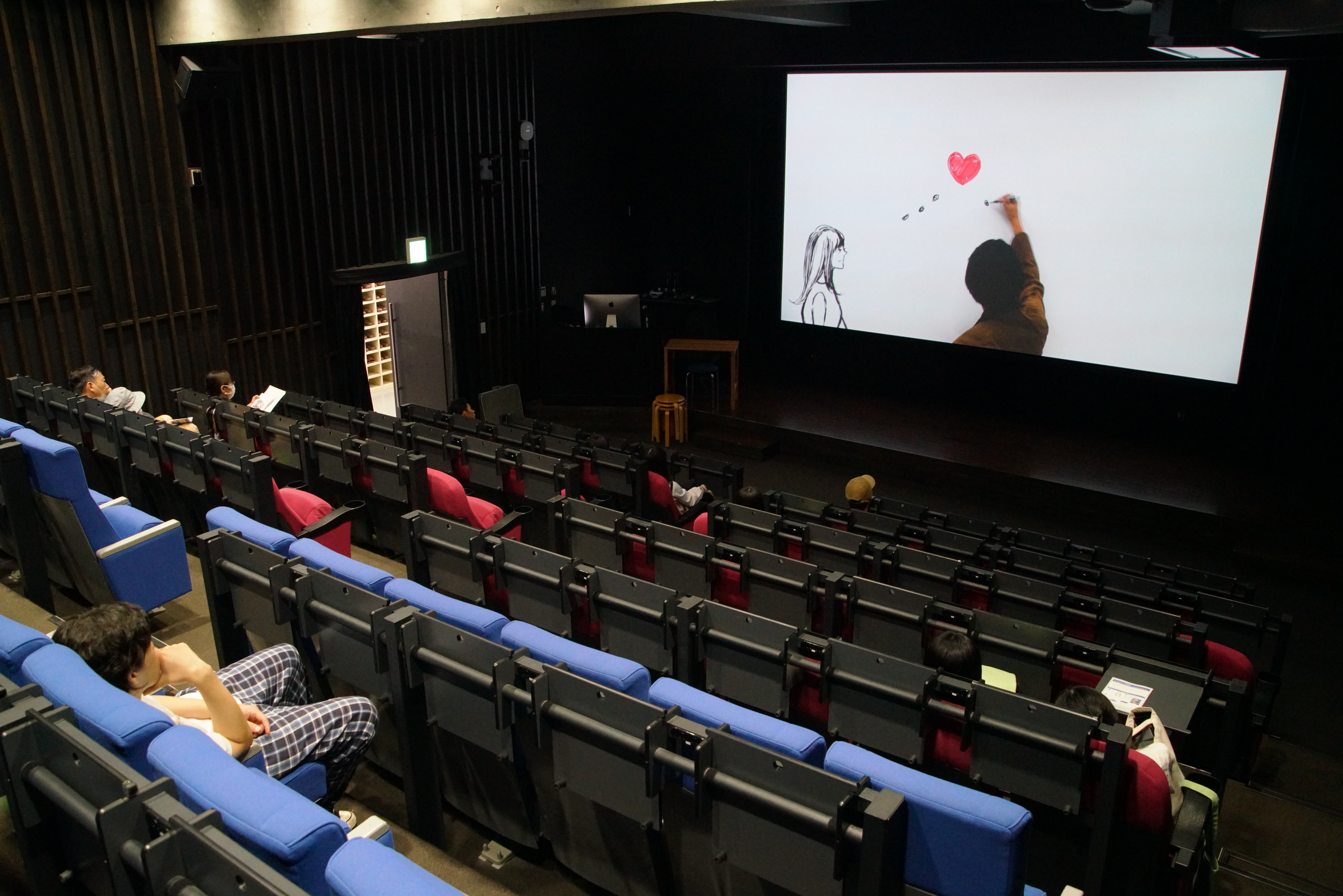 アニメ、CG、映画など、学生の優秀作品を大画面で上映中。いつでも入退場可能ですので、ご自由にご覧ください。休憩スペースとしても利用できます!